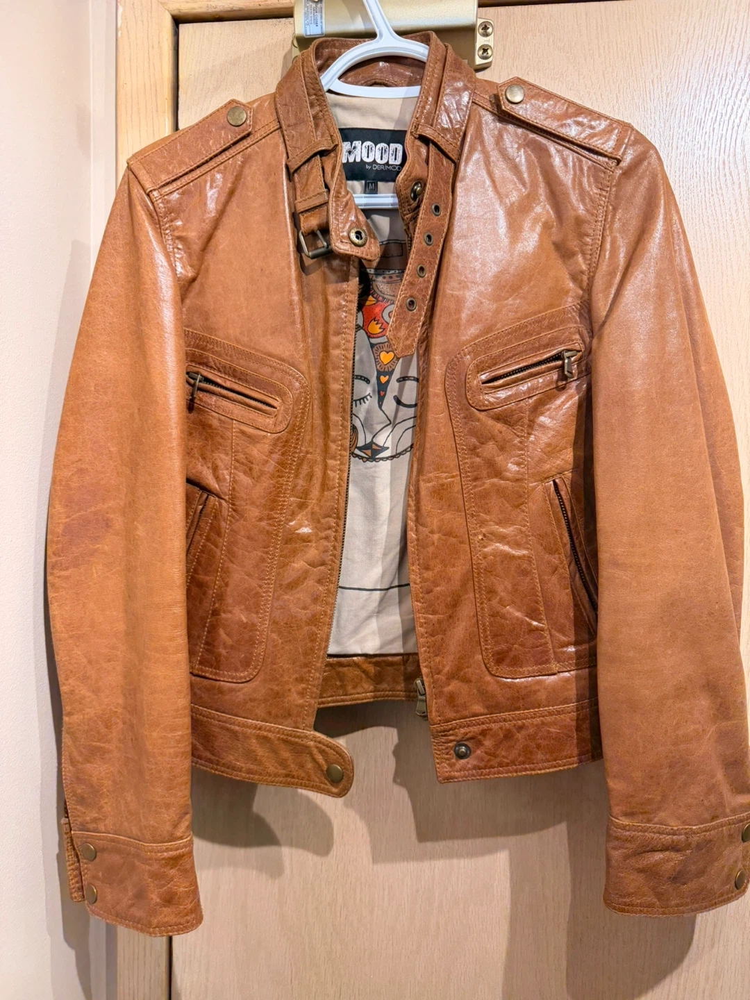 Selling a stylish MOOD by DERIMOD leather jacket in a lovely tan colour. It's a size medium and in great condition. Perfect for adding a bit of edge to any outfit!
