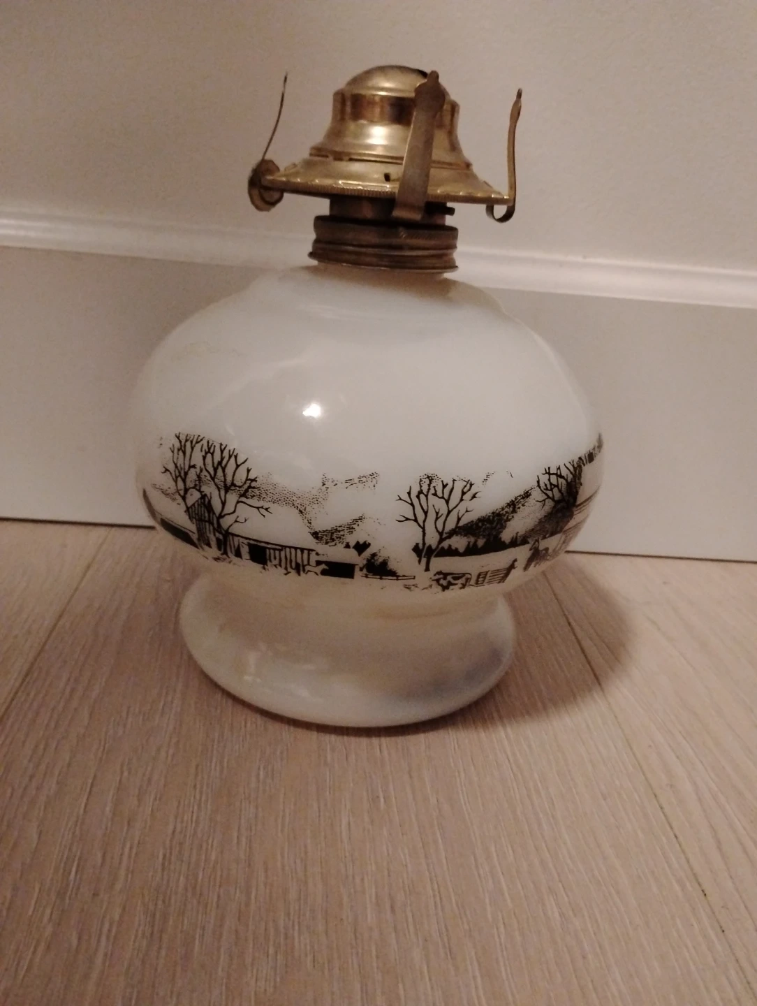 1960 Currier and Ives vintage Milk Glass Oil Lamp