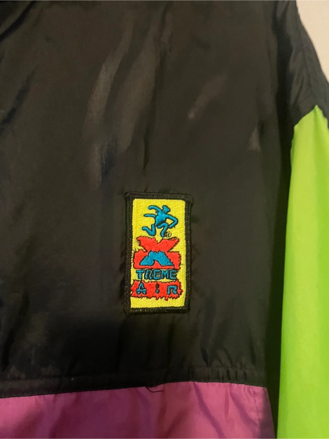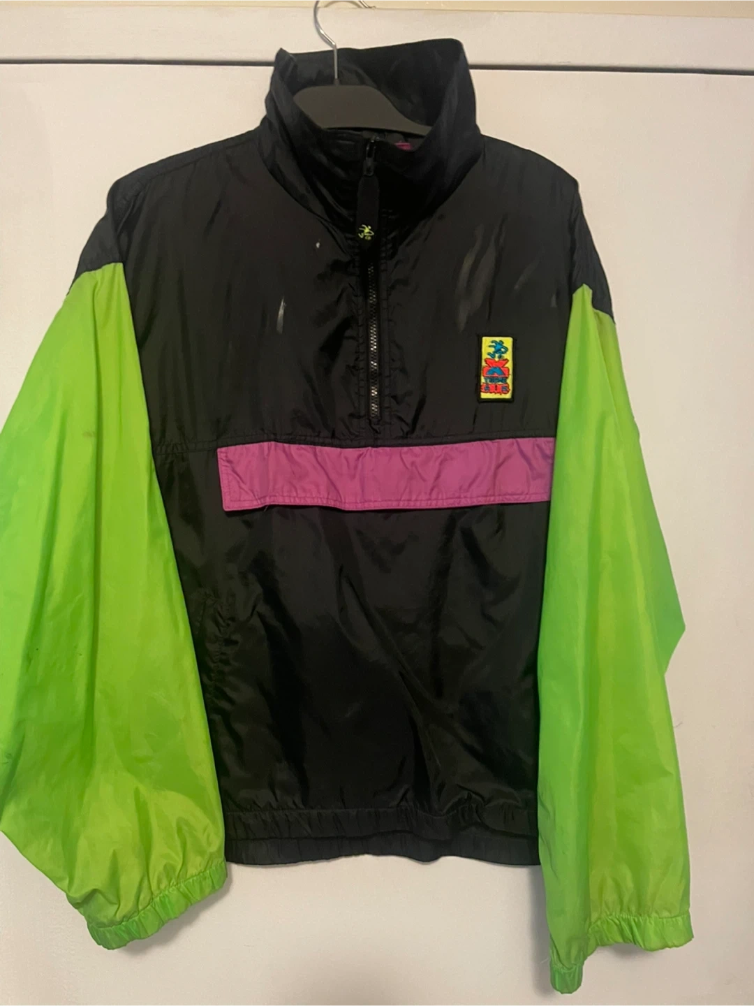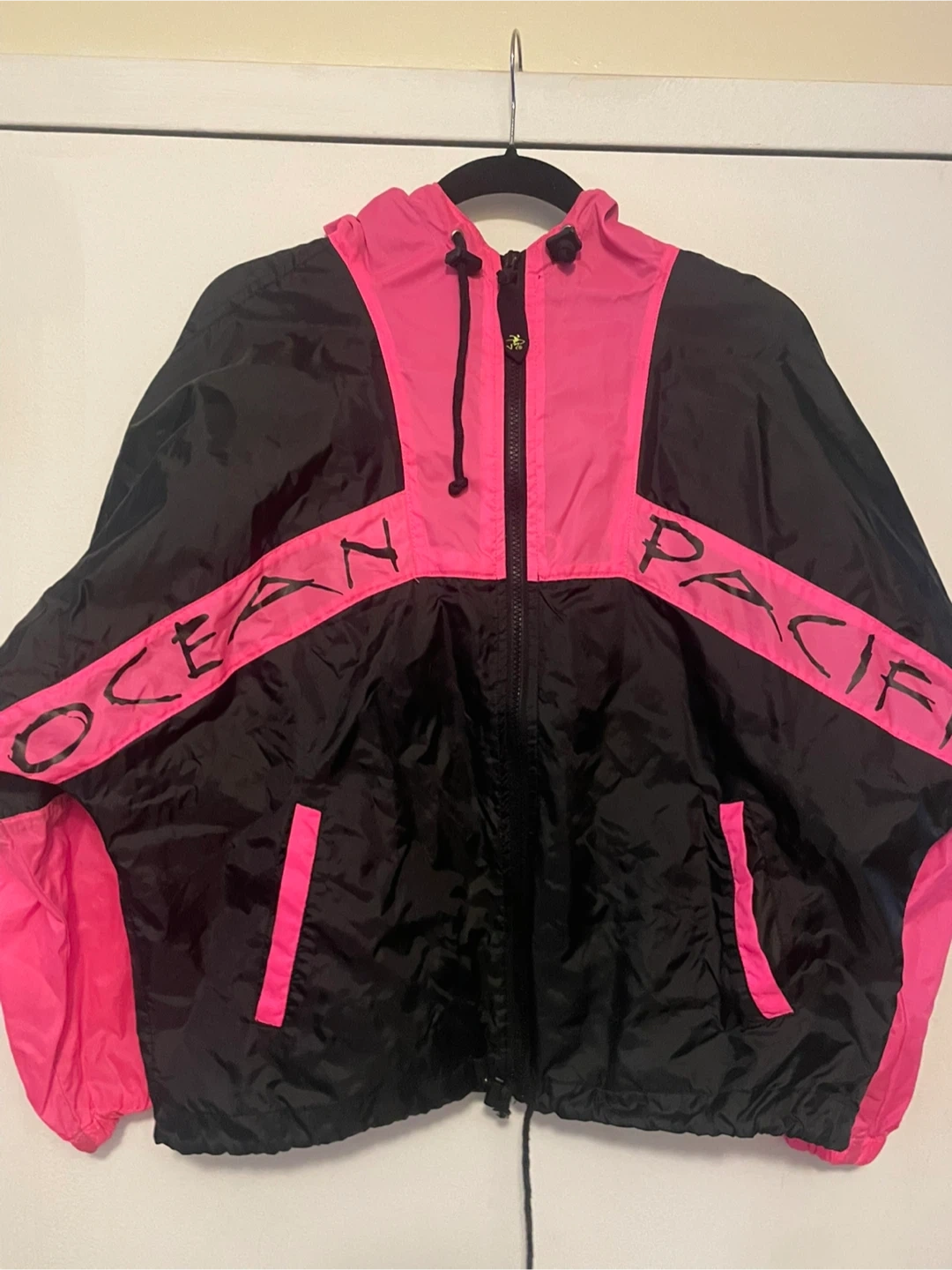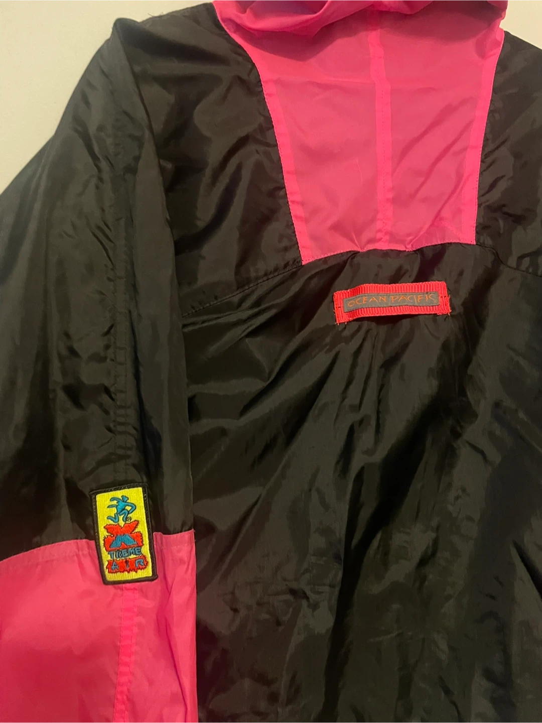 Selling a fun Ocean Pacific windbreaker! It's a size medium and has a cool, retro design with black, pink, and a bit of neon green. Perfect for adding a pop of color to your outfit!