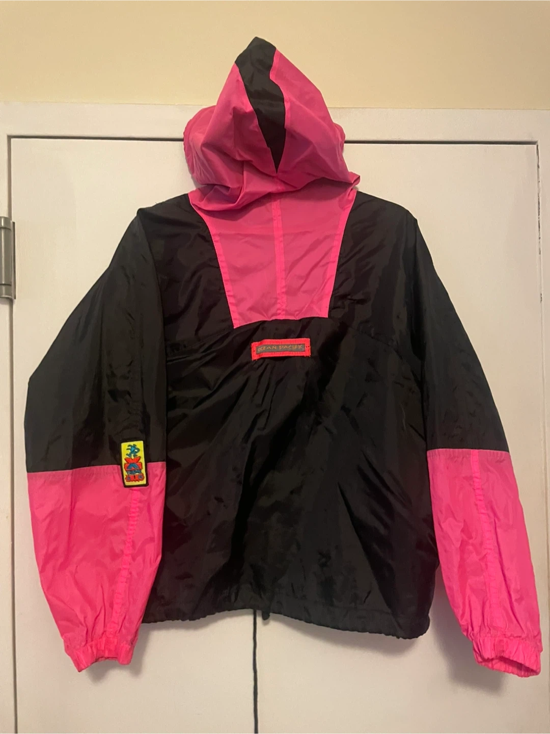 Selling a fun Ocean Pacific windbreaker! It's a size medium and has a cool, retro design with black, pink, and a bit of neon green. Perfect for adding a pop of color to your outfit!