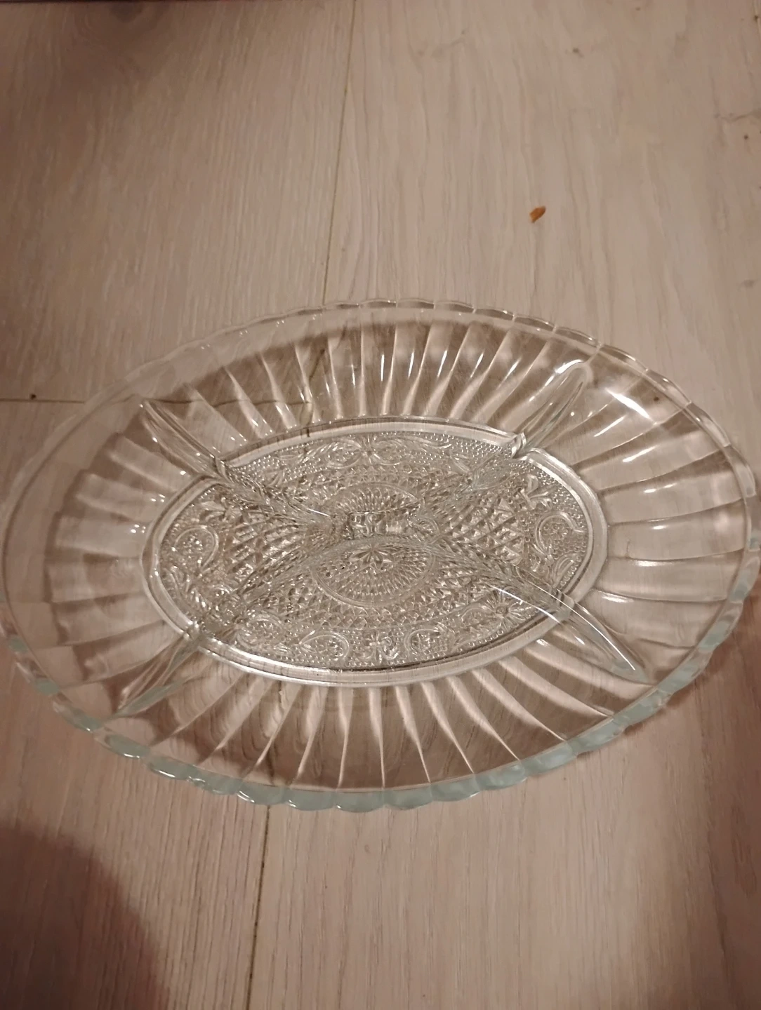Selling a beautiful vintage pressed glass serving dish! It features a lovely divided design, perfect for serving appetizers or snacks at your next gathering. It's in great condition and ready to add a touch of elegance to your table