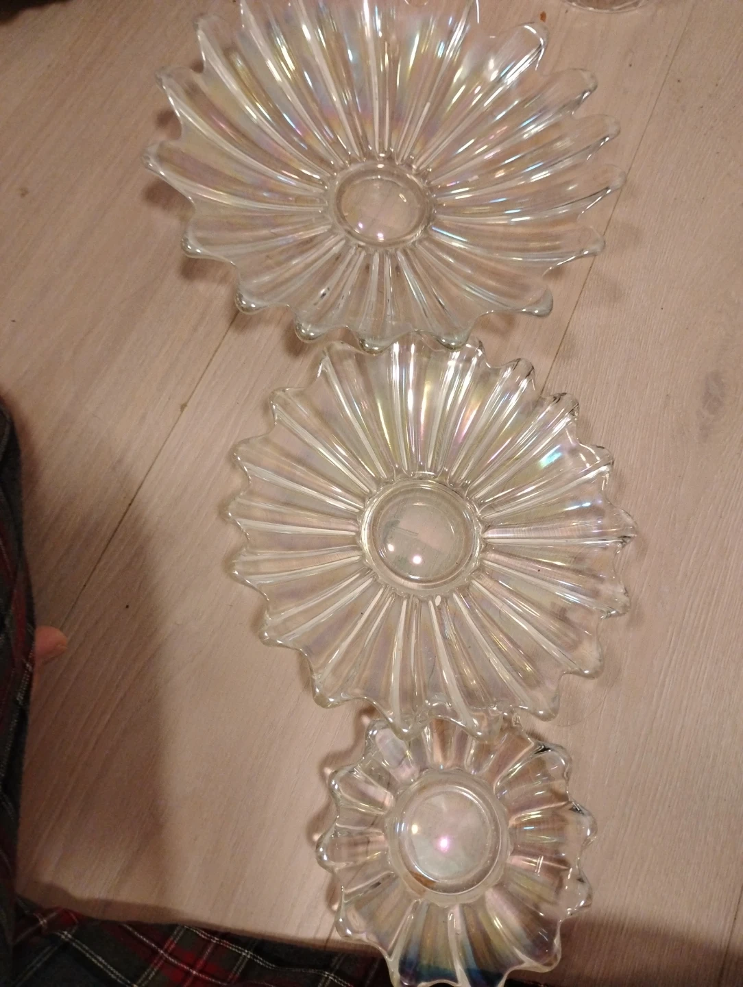 Selling a set of three iridescent glass plates. They have a unique flower shape and a beautiful, subtle shimmer. Perfect for adding a touch of elegance to your table setting!