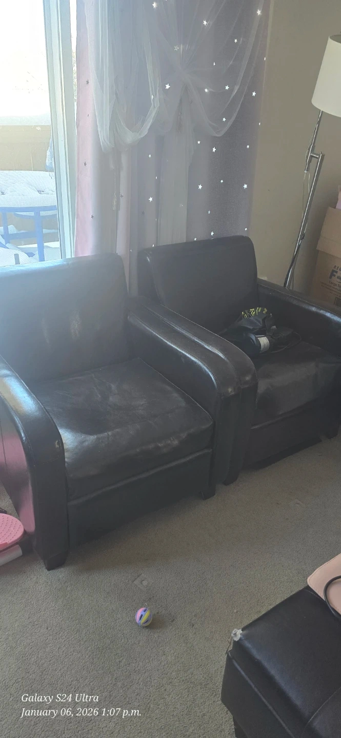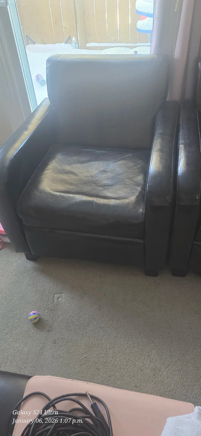Here are two black leather armchairs. Good for start up. They are in good condition and would be great for a living room or den. It's free yes you read it right I am giving away this stuffs for free. Reason moving.