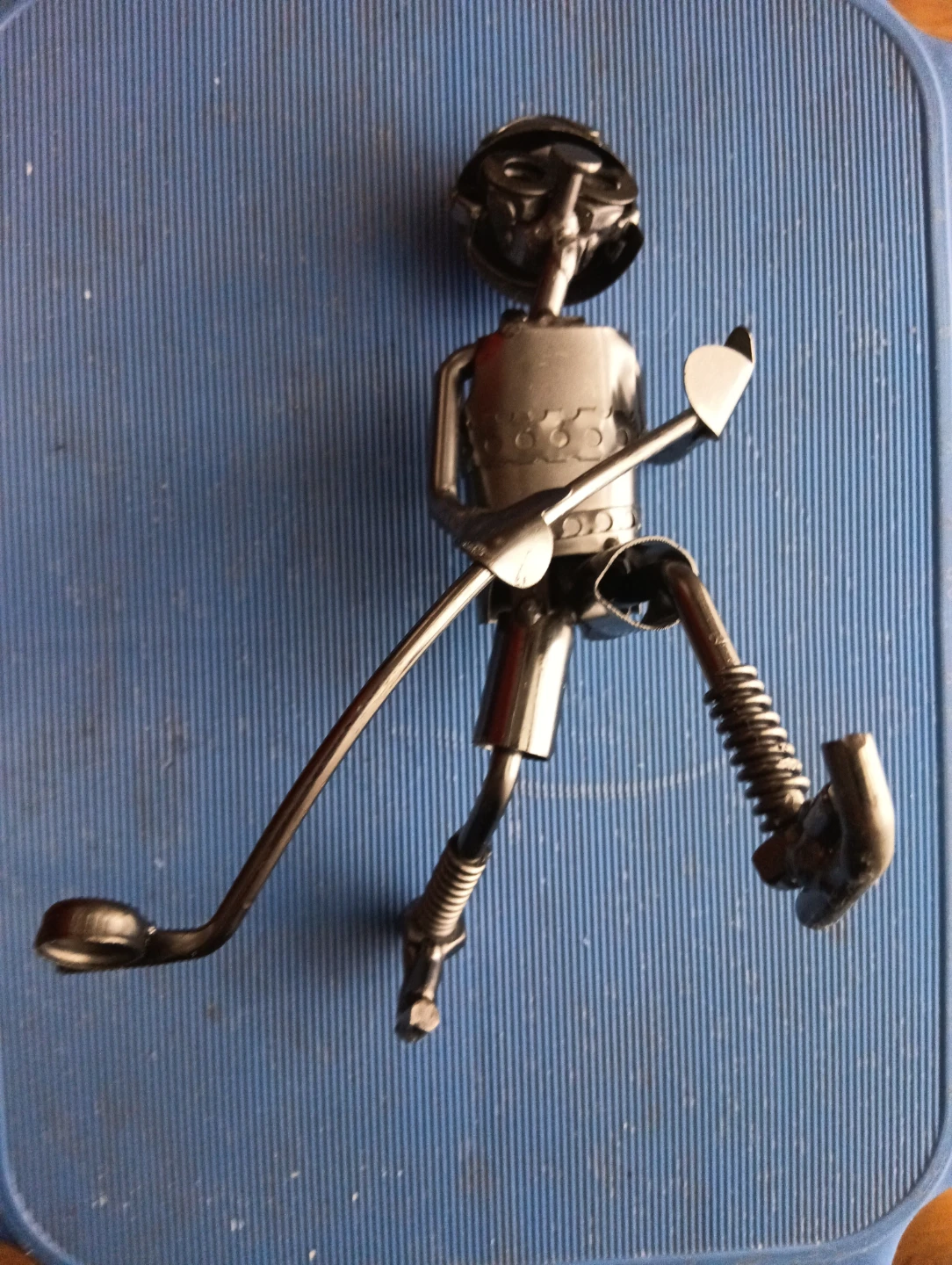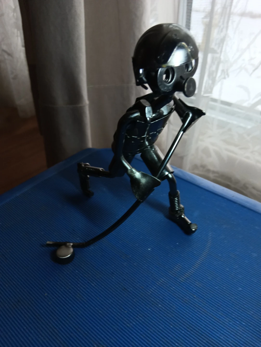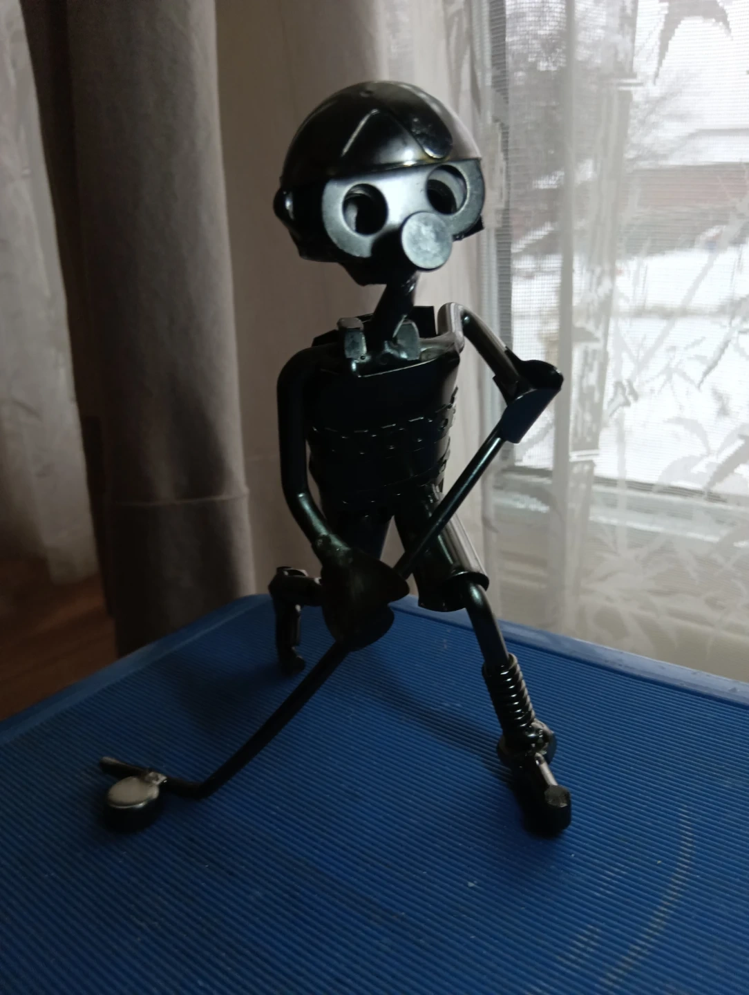 This is a handcrafted metal figurine of a hockey player. It's a sturdy and unique piece of art, perfect for any hockey fan's collection or as a decorative item for your home