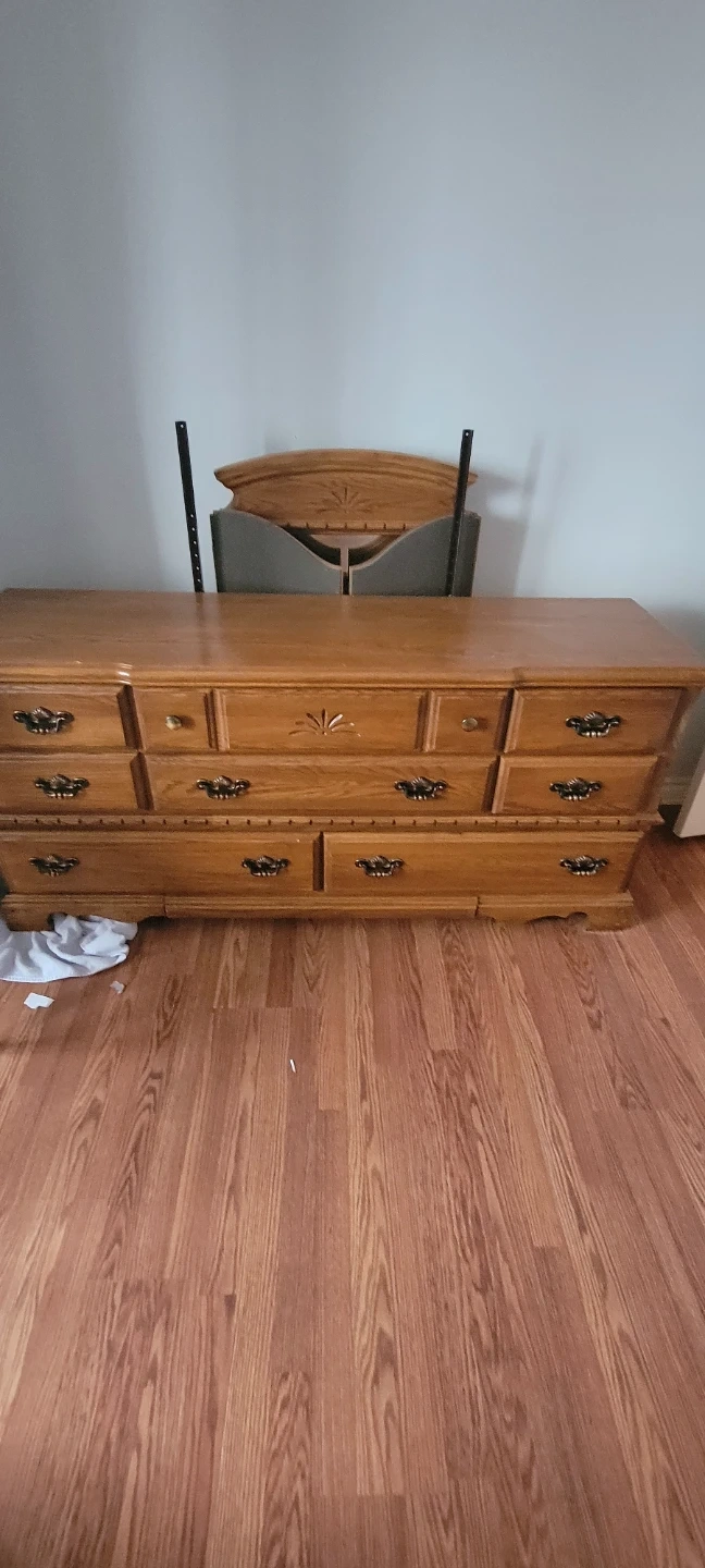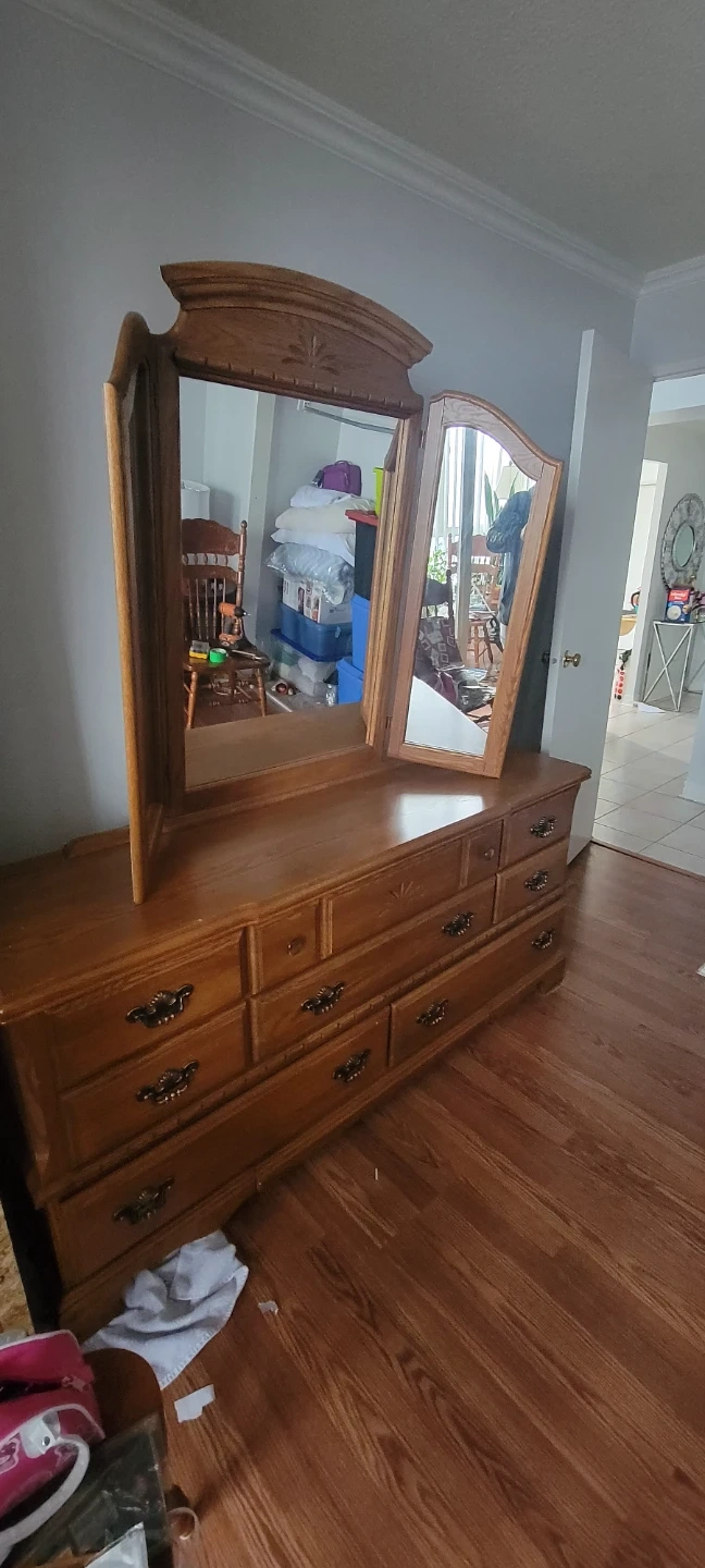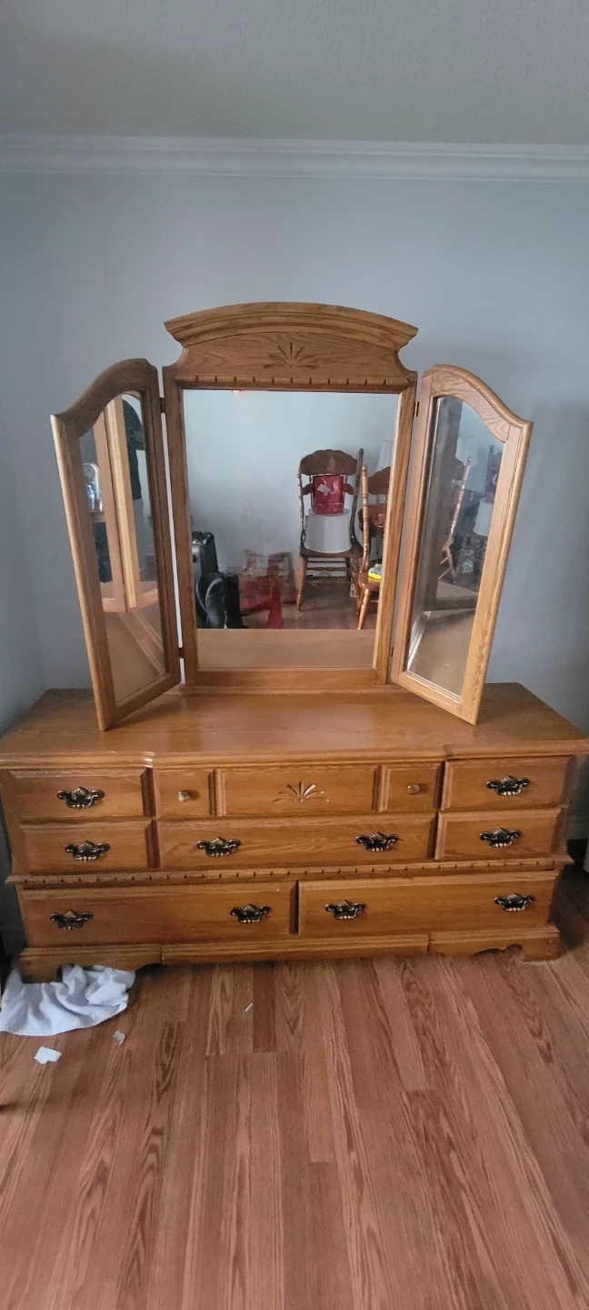 Selling a wooden dresser that comes with a tri-fold mirror. It has multiple drawers, which is great for storage! It's in good condition and would look great in any bedroom obo
