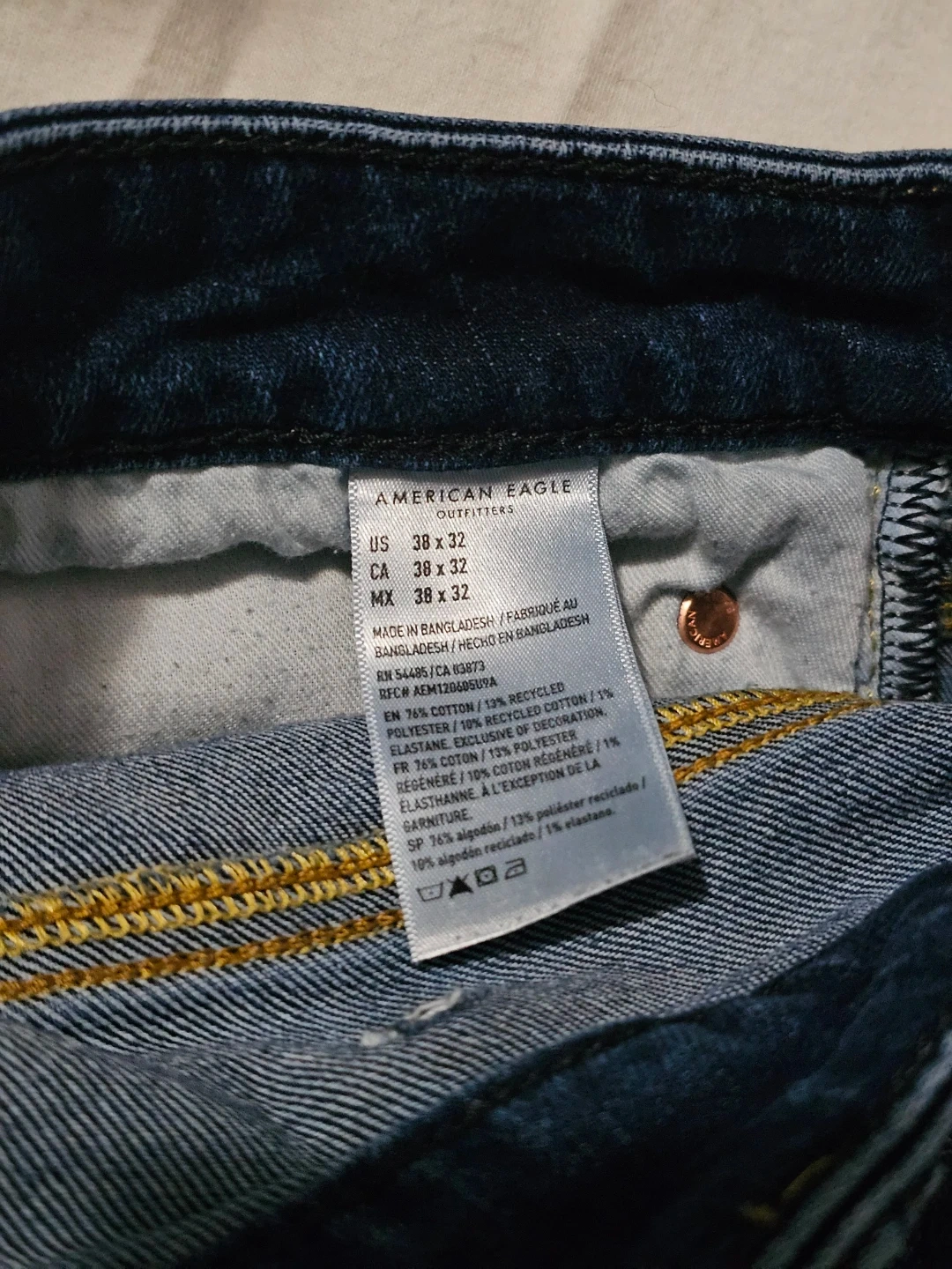 Selling a pair of American Eagle Outfitters jeans in size 38x32. They're in great shape and ready for a new owner! The material is 76% cotton, 13% recycled cotton, 10% polyester, and 1% elastane.