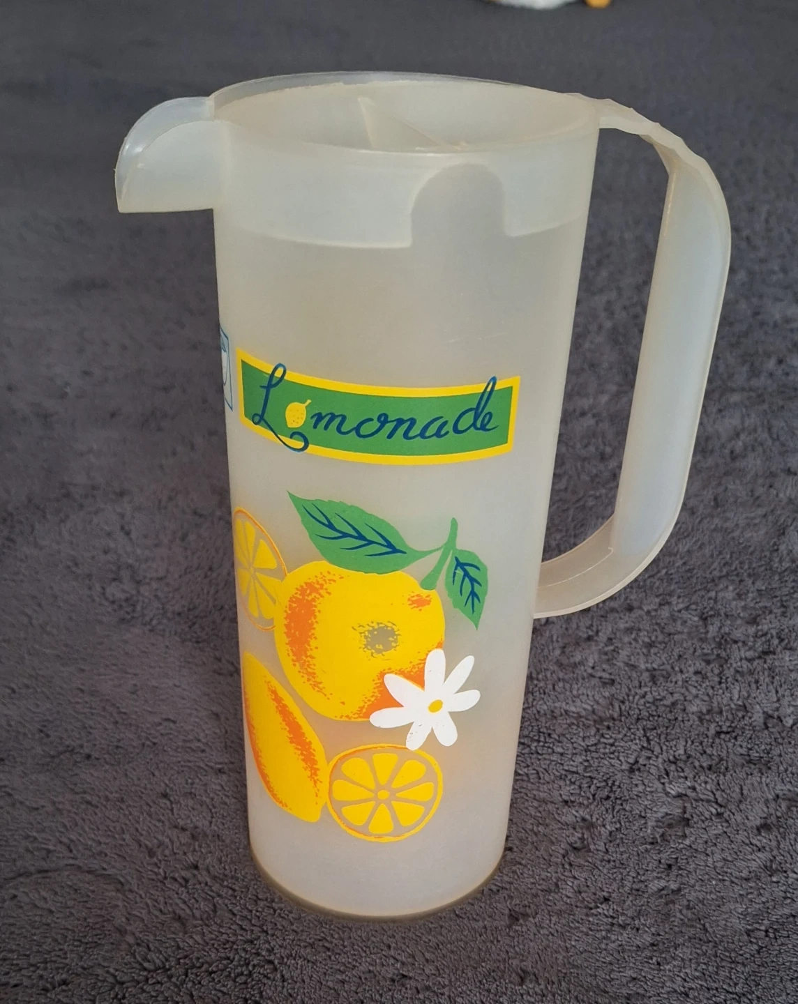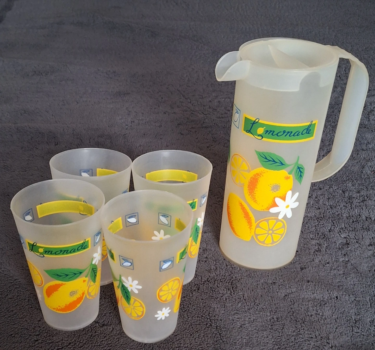 Selling a cute lemonade pitcher with four matching glasses! Perfect for summer get-togethers or just adding a bit of sunshine to your kitchen. The pitcher and glasses have a fun lemonade design with lemons and flowers. They're in great condition and ready for a new home!