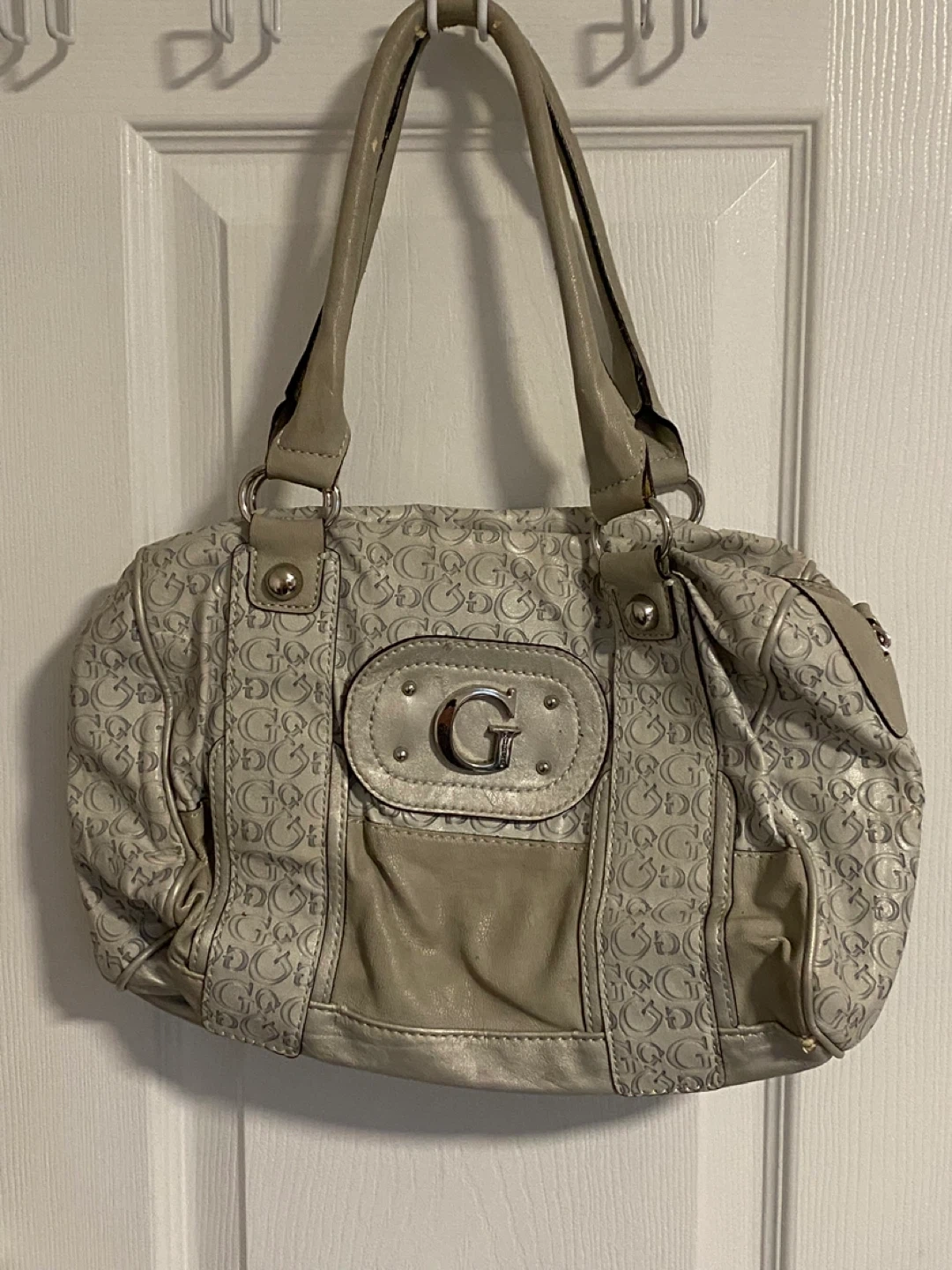 Cute Guess purse featuring the 'G' logo all over! It's a beige/silver colour, perfect for any outfit. Gently used, but still in great shape!