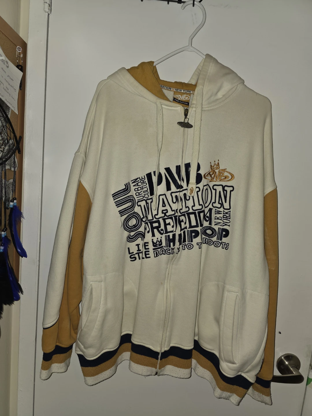 Selling a PNB Nation hoodie in cream and gold. It features a unique design with 'PNB Nation' and 'Urban Culture' graphics. Great for a retro streetwear look!