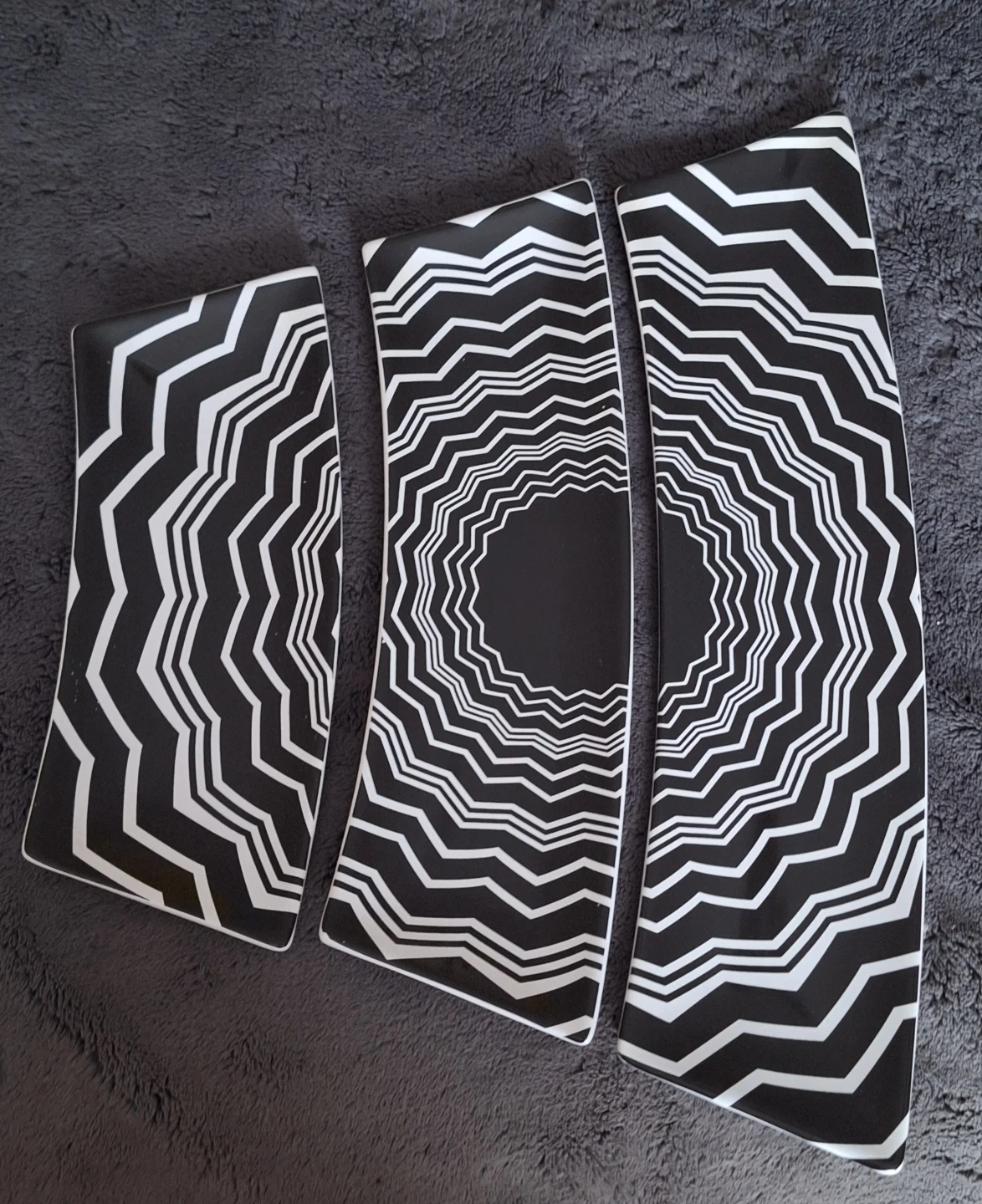 Selling a set of three decorative serving plates with a striking black and white geometric pattern. They're great for serving appetizers when you're hosting a party.