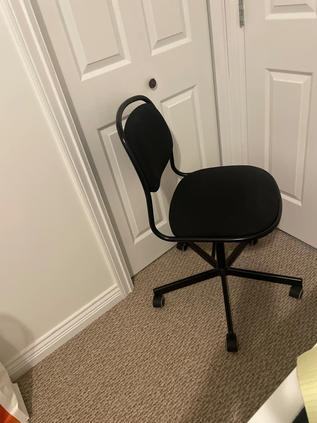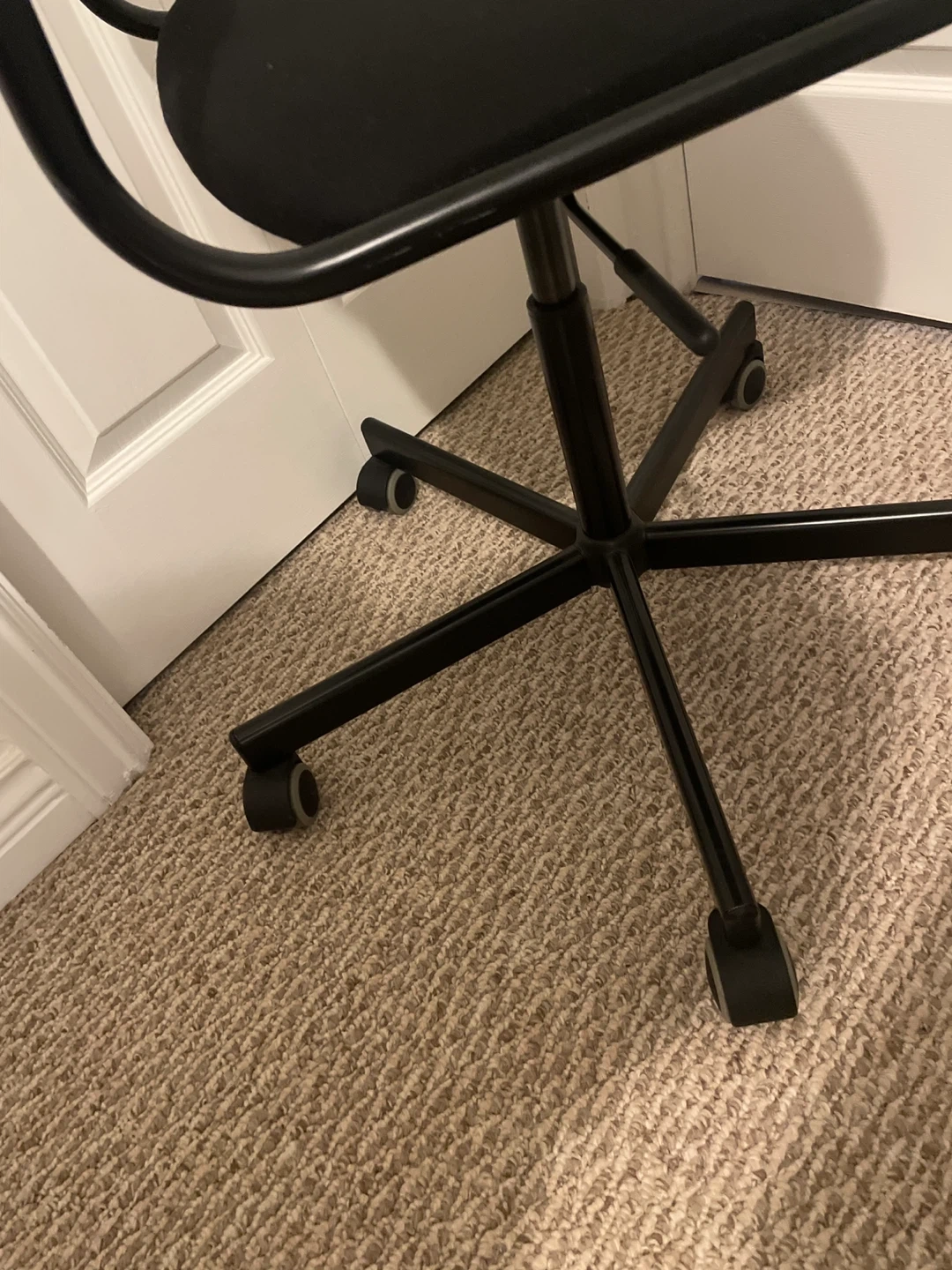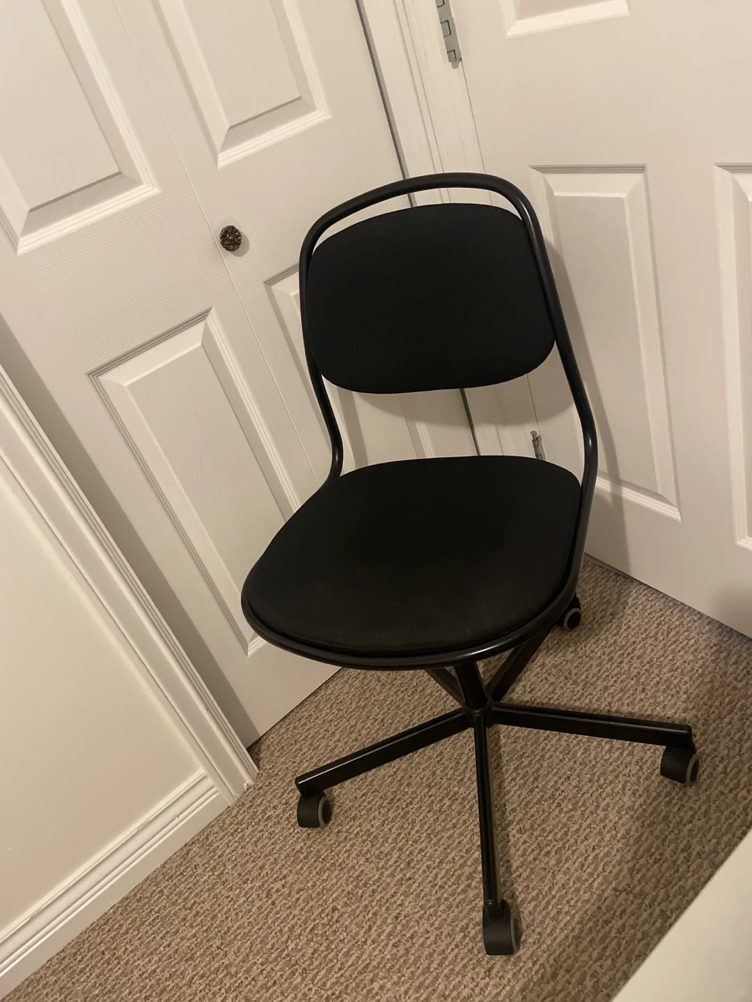 Selling a black office chair! It's in great shape and perfect for a home office or study space. It has a padded seat and back for comfort, and it rolls smoothly on its wheels.