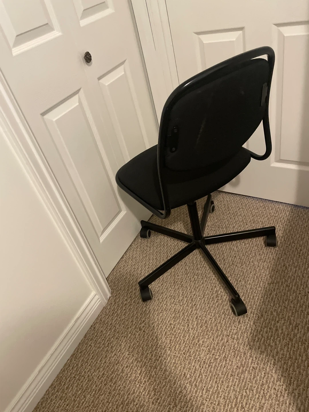 Selling a black office chair! It's in great shape and perfect for a home office or study space. It has a padded seat and back for comfort, and it rolls smoothly on its wheels.