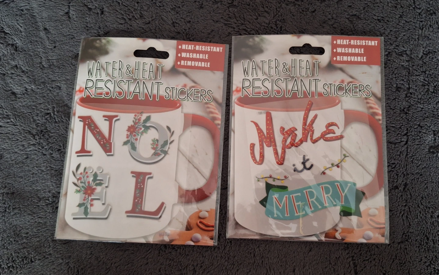 I''m selling two packs of water and heat-resistant stickers! One pack spells out "Noel" and the other says "Make it Merry" They're also washable and removable, perfect for adding some festive cheer to your mugs or other items