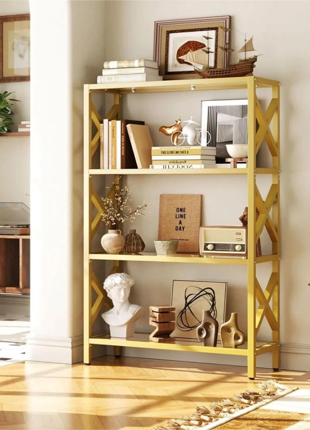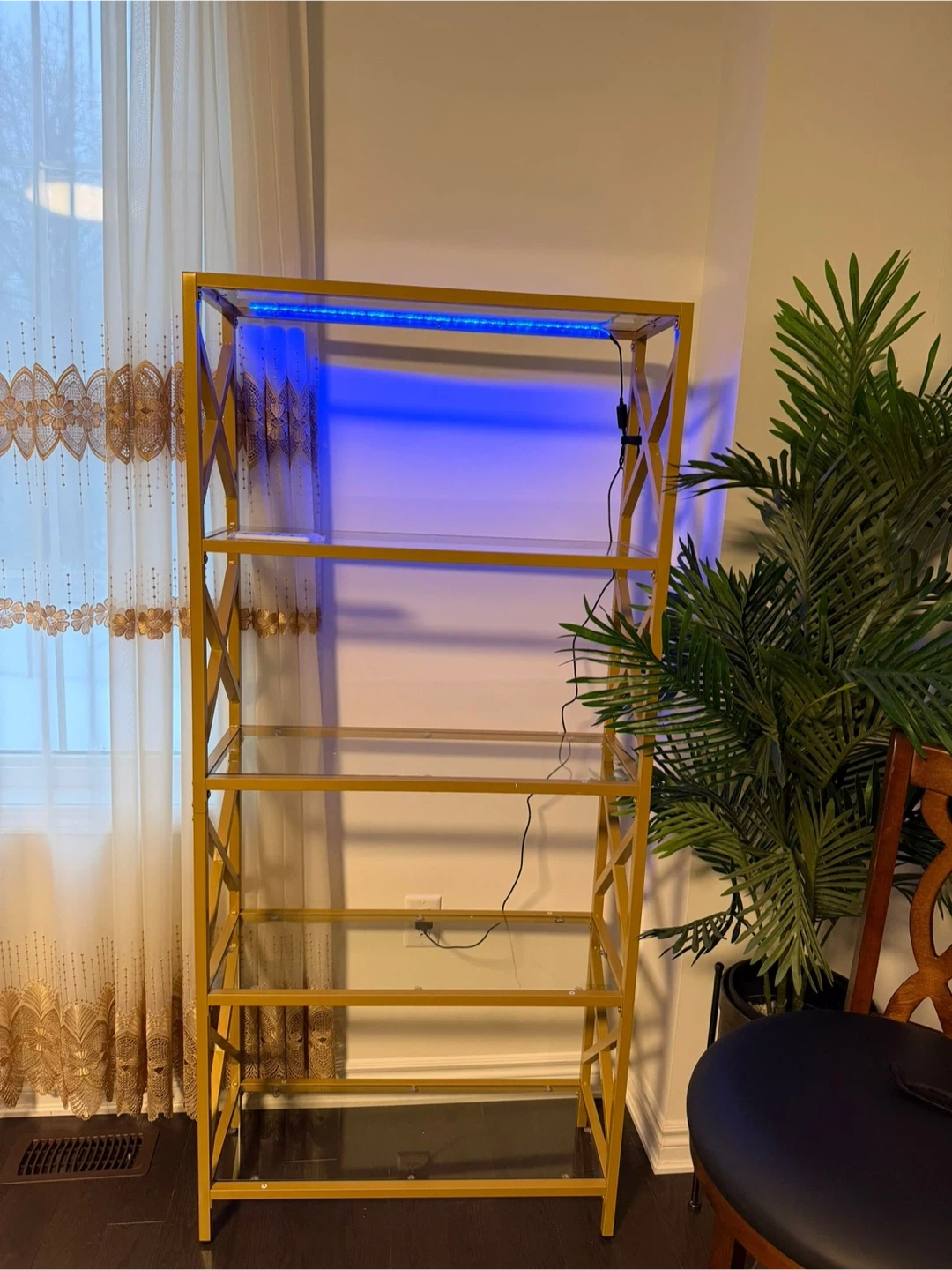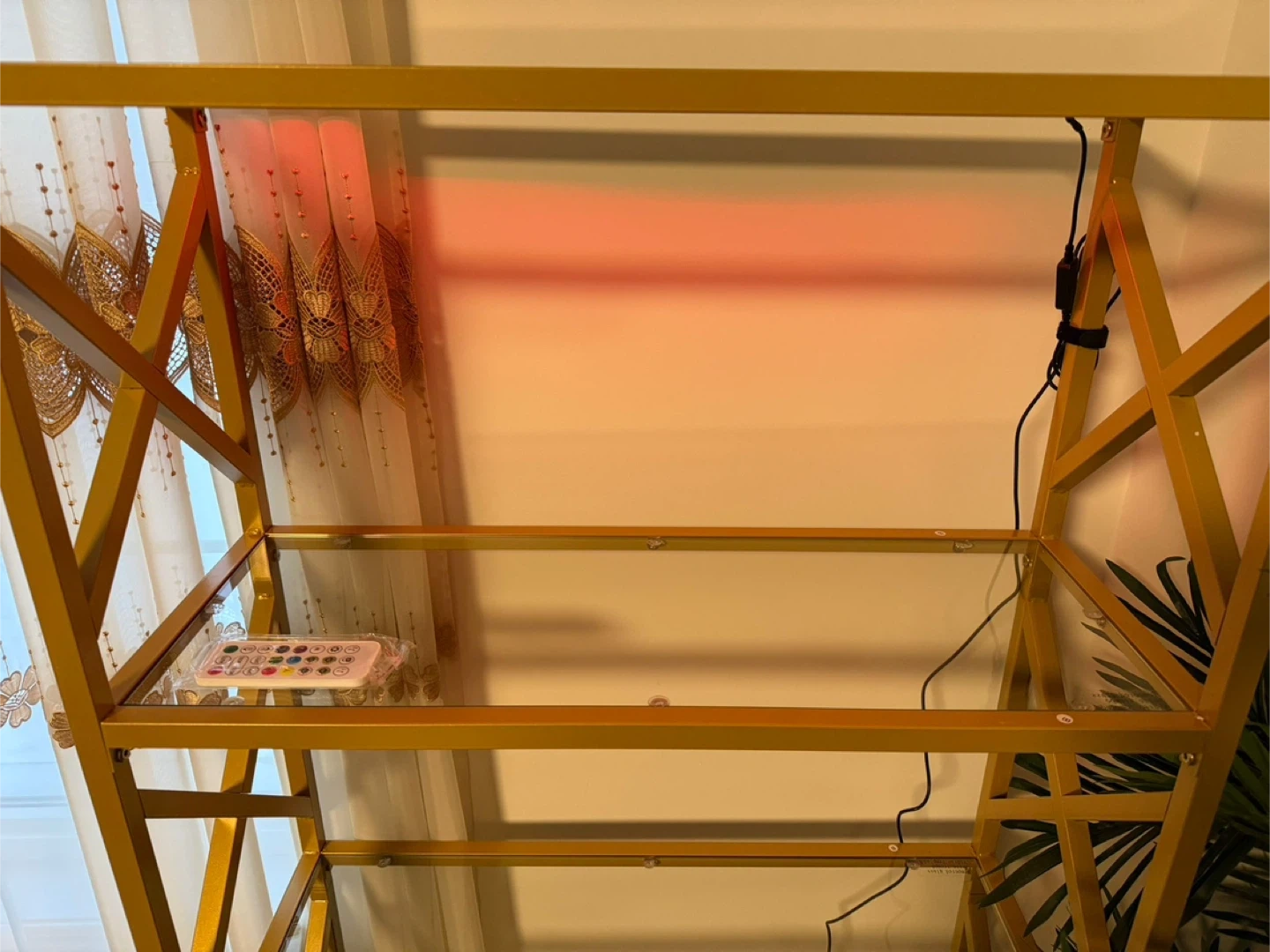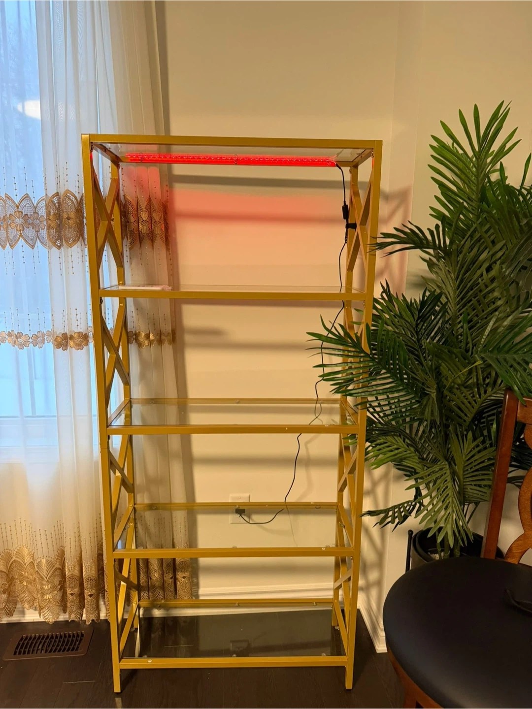 Here's a stylish gold metal display shelf with glass shelves. It has a modern, geometric design that would look great in any room. The shelf also comes with LED lighting, so you can show off your favourite items!