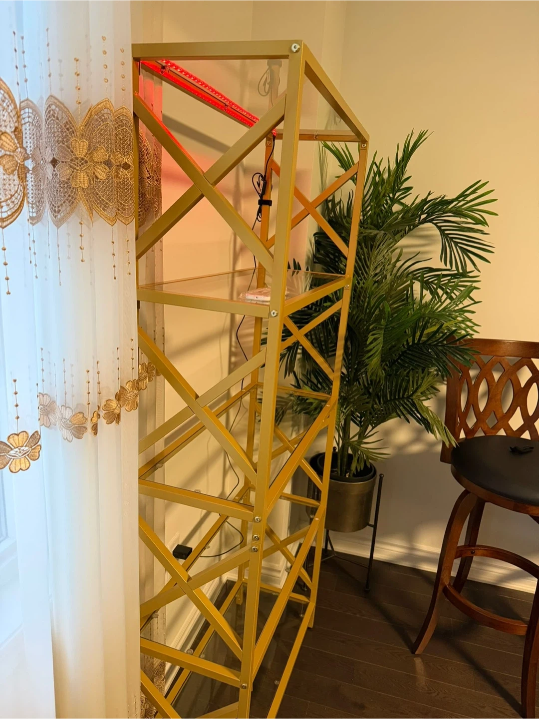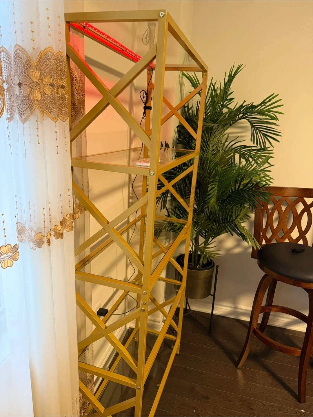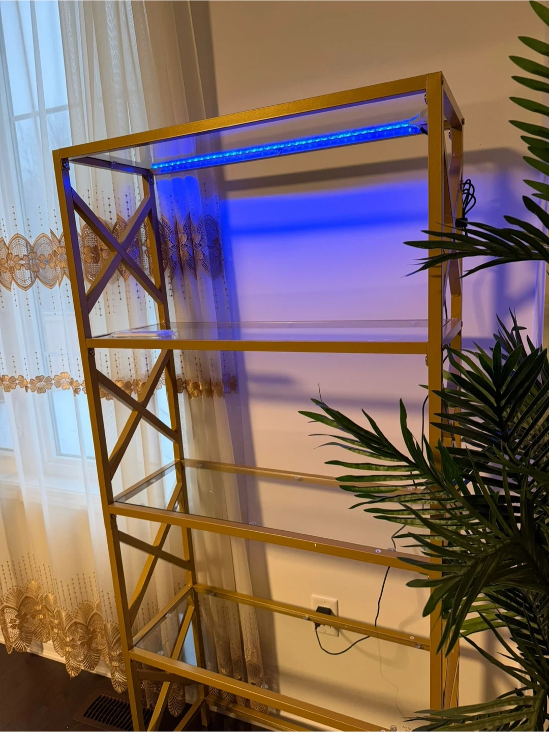 Here's a stylish gold metal display shelf with glass shelves. It has a modern, geometric design that would look great in any room. The shelf also comes with LED lighting, so you can show off your favourite items!