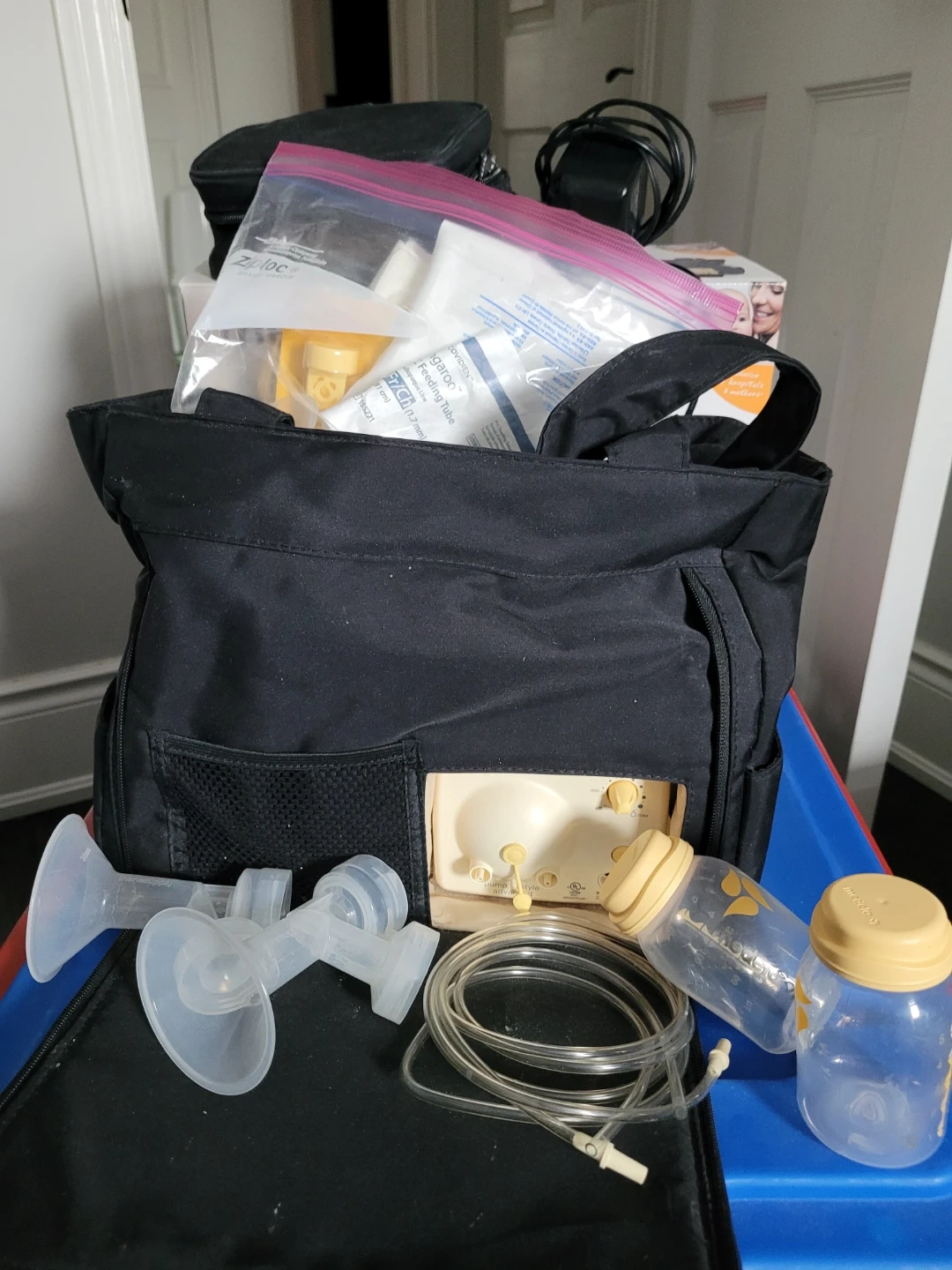 Selling a Medela Pump in Style Advanced double breast pump and additional accessories. It is incorporated in a tote bag for easy portability. This pump features 2-phase expression technology, designed to produce more milk in less time. It's suitable for daily use and designed for mothers who pump several times a day. The box is included!