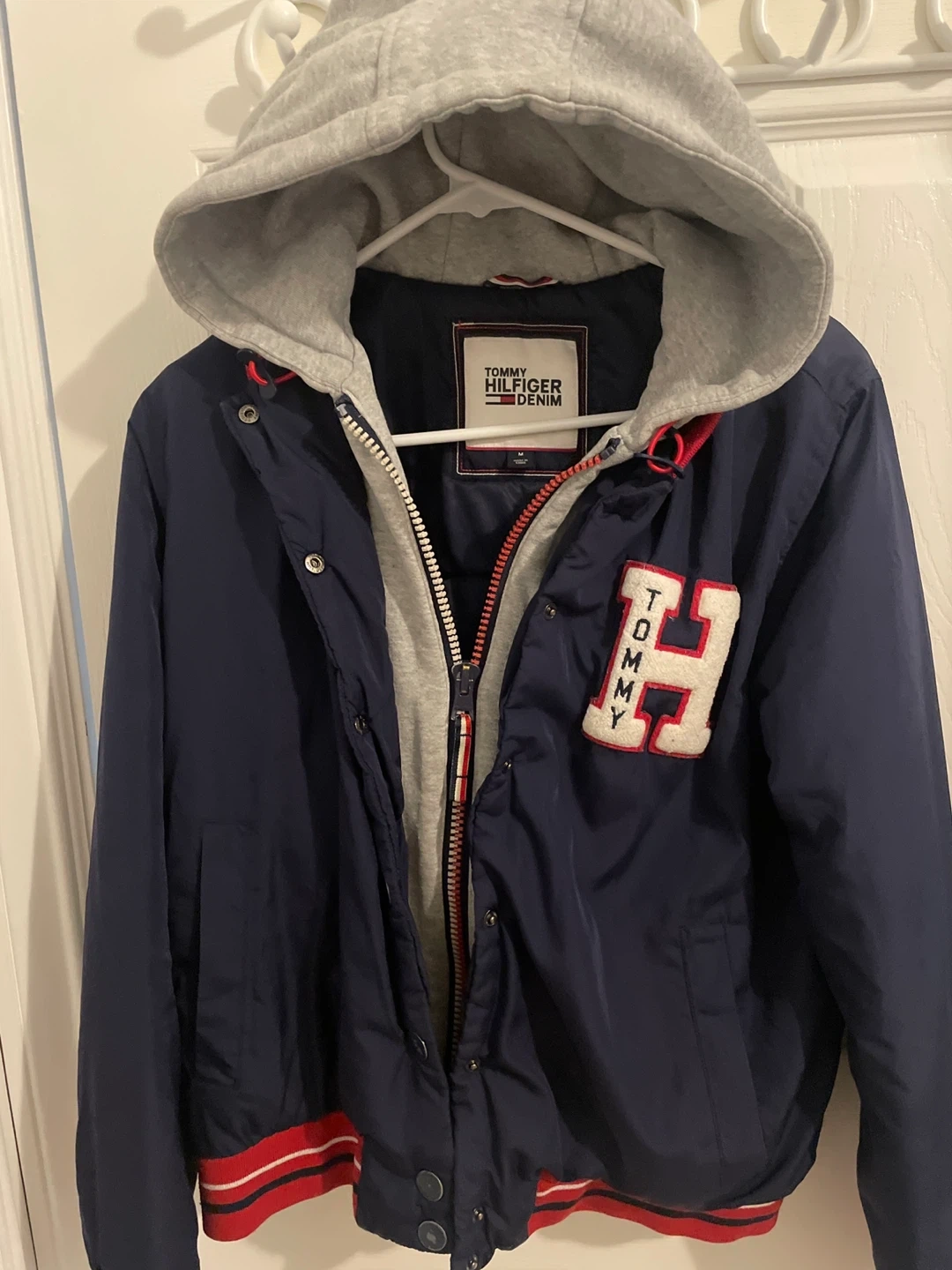 Tommy Hilfiger Denim jacket for sale! It's a size medium and features a stylish hooded design. The jacket is in great condition and ready for a new owner. Can be mens or women’s.