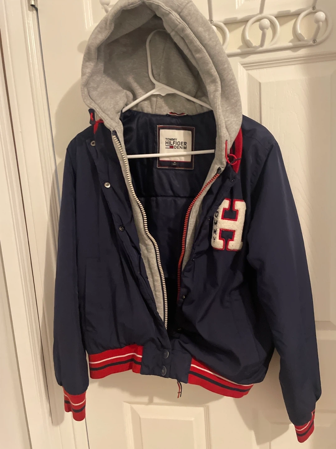 Tommy Hilfiger Denim jacket for sale! It's a size medium and features a stylish hooded design. The jacket is in great condition and ready for a new owner. Can be mens or women’s.