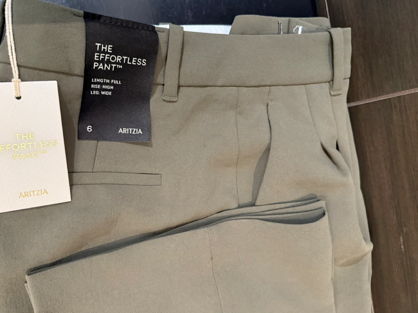 Selling a pair of Aritzia The Effortless Pants in a stylish olive green colour in crepe fabric. These pants are super comfortable and perfect for any occasion! They are brand new and still have the tags on.