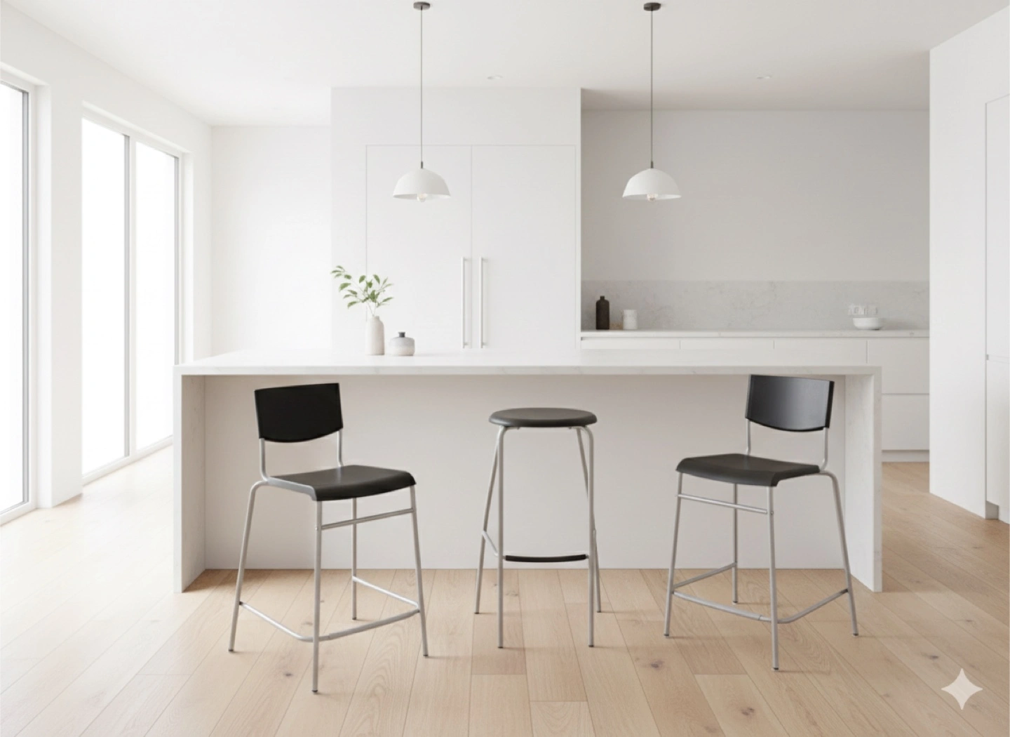 Selling a set of three counter height stools. They feature a sleek design with black seats and silver frames. Perfect for a kitchen island or bar area
