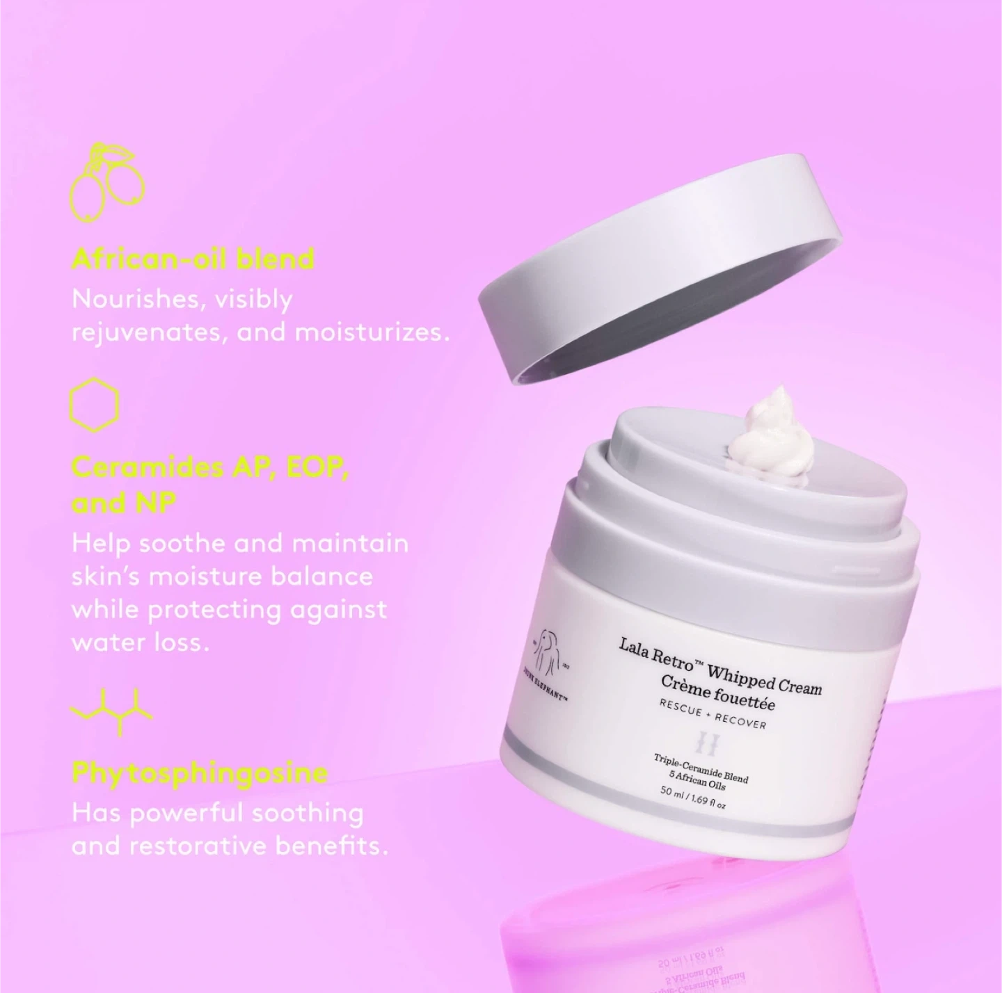 This is a Drunk Elephant Lala Retro Whipped Cream. It's a rescue and recover cream with a triple-ceramide blend and 5 African oils. This cream nourishes, visibly rejuvenates, and moisturizes, helping to soothe and maintain skin's moisture balance while protecting against water loss. It also has powerful soothing and restorative benefits, clinically proven to provide all-day moisture and strengthen the skin barrier immediately and over time. 93% agreed skin looked healthier and felt replenished, and 91% agreed skin felt nourished.