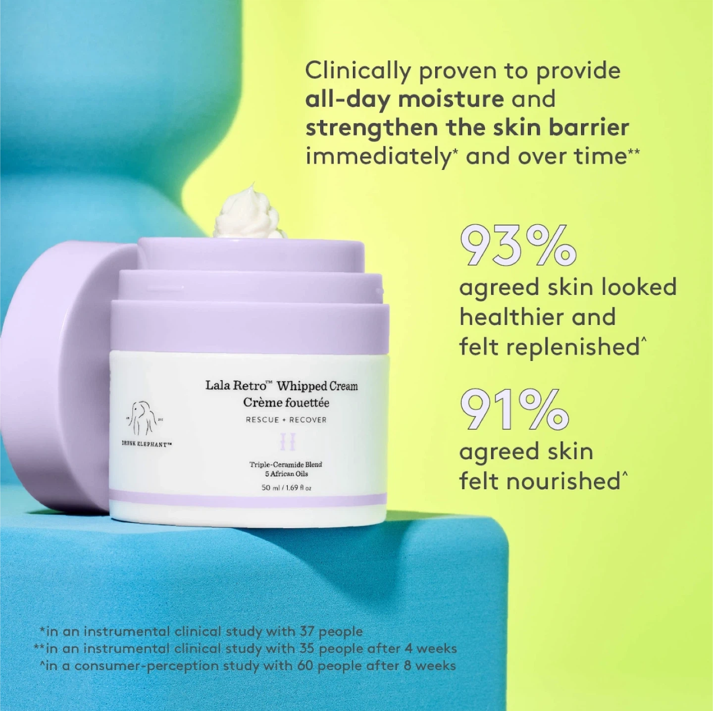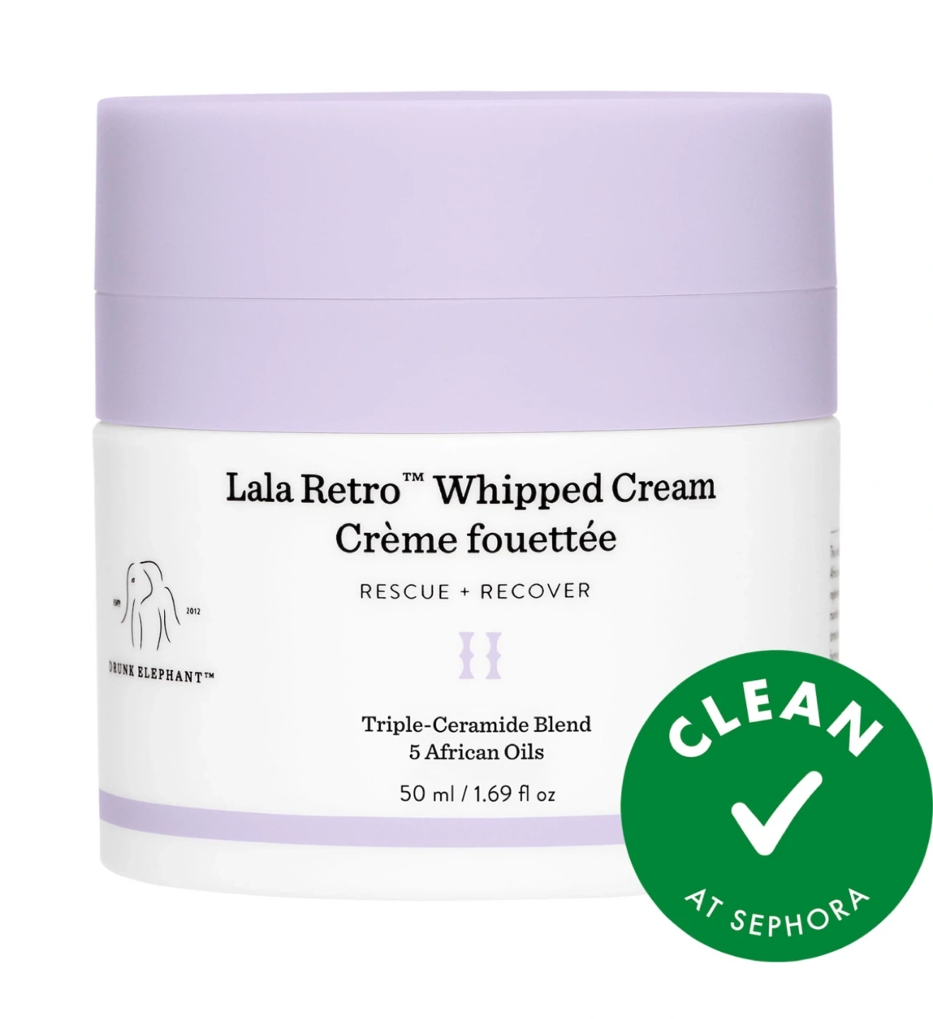 This is a Drunk Elephant Lala Retro Whipped Cream. It's a rescue and recover cream with a triple-ceramide blend and 5 African oils. This cream nourishes, visibly rejuvenates, and moisturizes, helping to soothe and maintain skin's moisture balance while protecting against water loss. It also has powerful soothing and restorative benefits, clinically proven to provide all-day moisture and strengthen the skin barrier immediately and over time. 93% agreed skin looked healthier and felt replenished, and 91% agreed skin felt nourished.