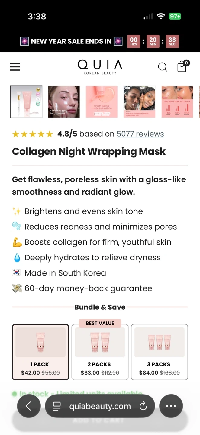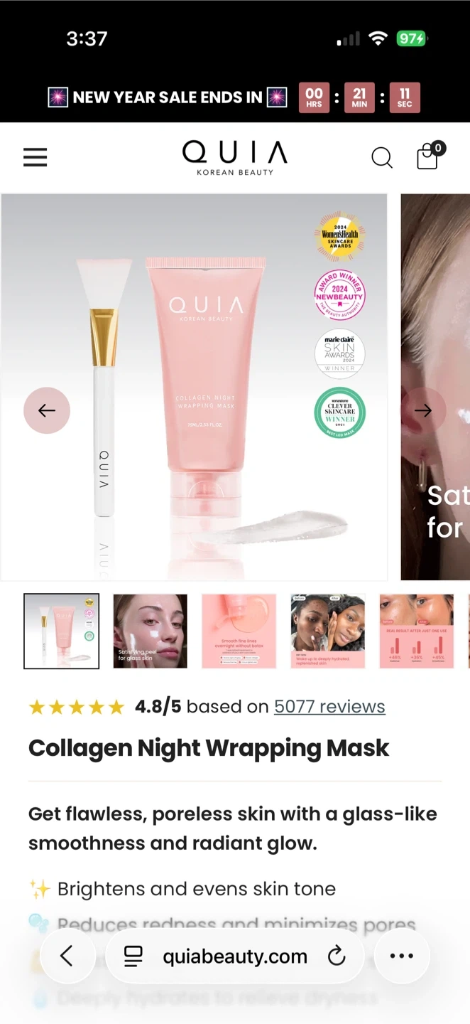 Get flawless, poreless skin with QUIA's Collagen Night Wrapping Mask! This mask is designed to brighten and even skin tone, reduce redness, minimize pores, boost collagen, and deeply hydrate to relieve dryness. It's made in Korea and comes in a 75ml bottle. Apply generously after cleansing, allow to dry for 15 minutes, and leave on overnight for refreshed, glowing skin