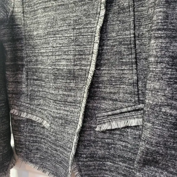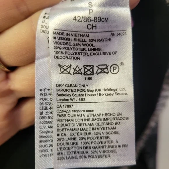 Banana Republic blazer in size small (S/P). Made in Vietnam. The shell is 52% rayon, 28% wool, and 20% polyester. The lining is 100% polyester, exclusive of decoration
