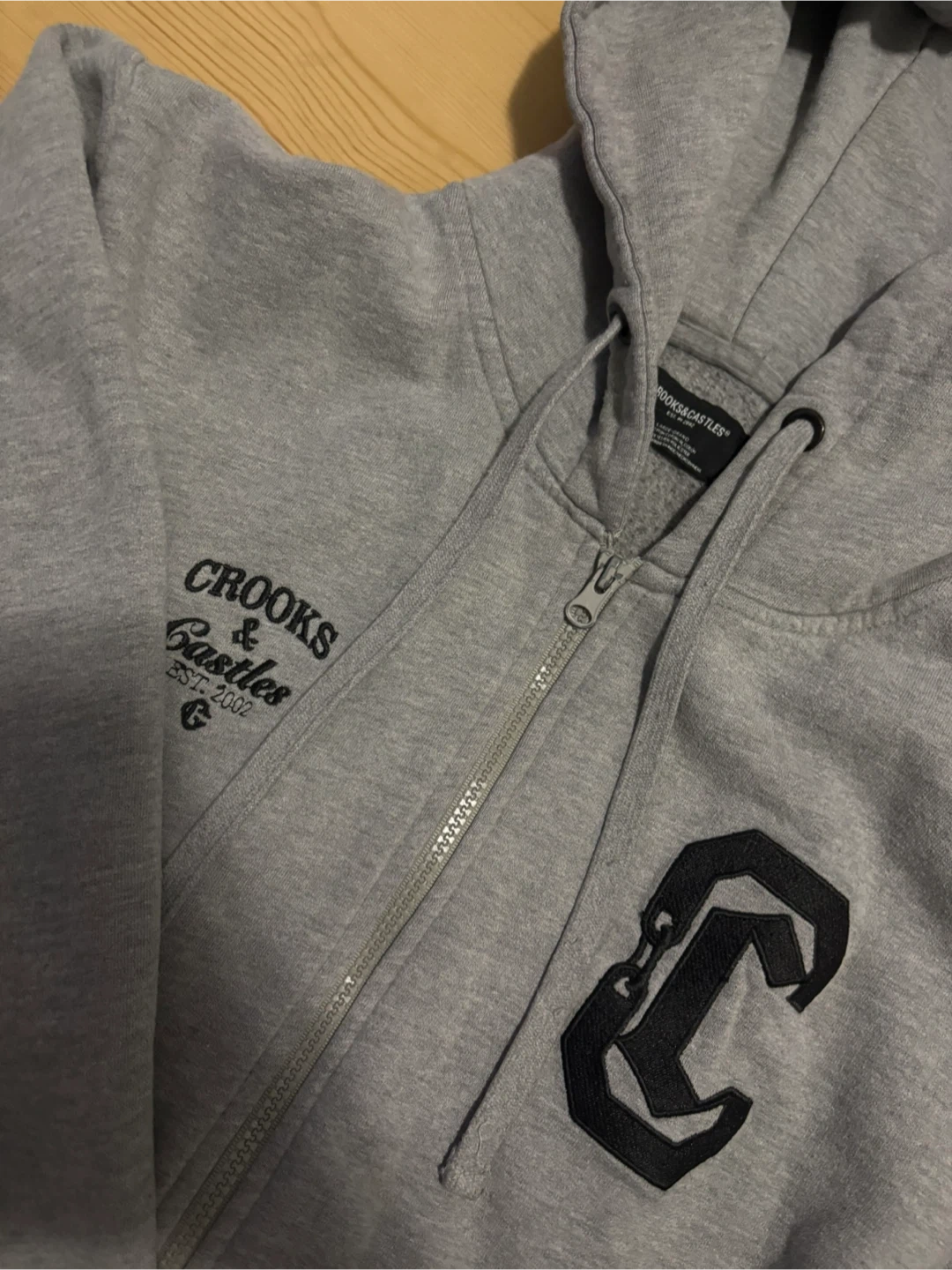 Selling a gently used grey zip-up hoodie from Crooks & Castles! It features the brand's logo and unique design on the front and back. Perfect for adding a bit of street style to your wardrobe. It's in great condition and ready for a new home!