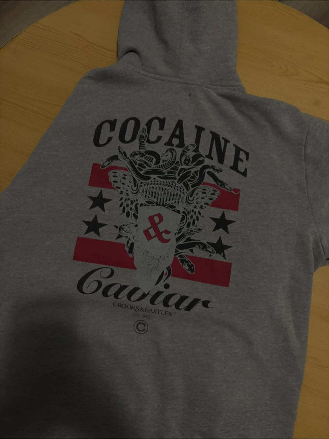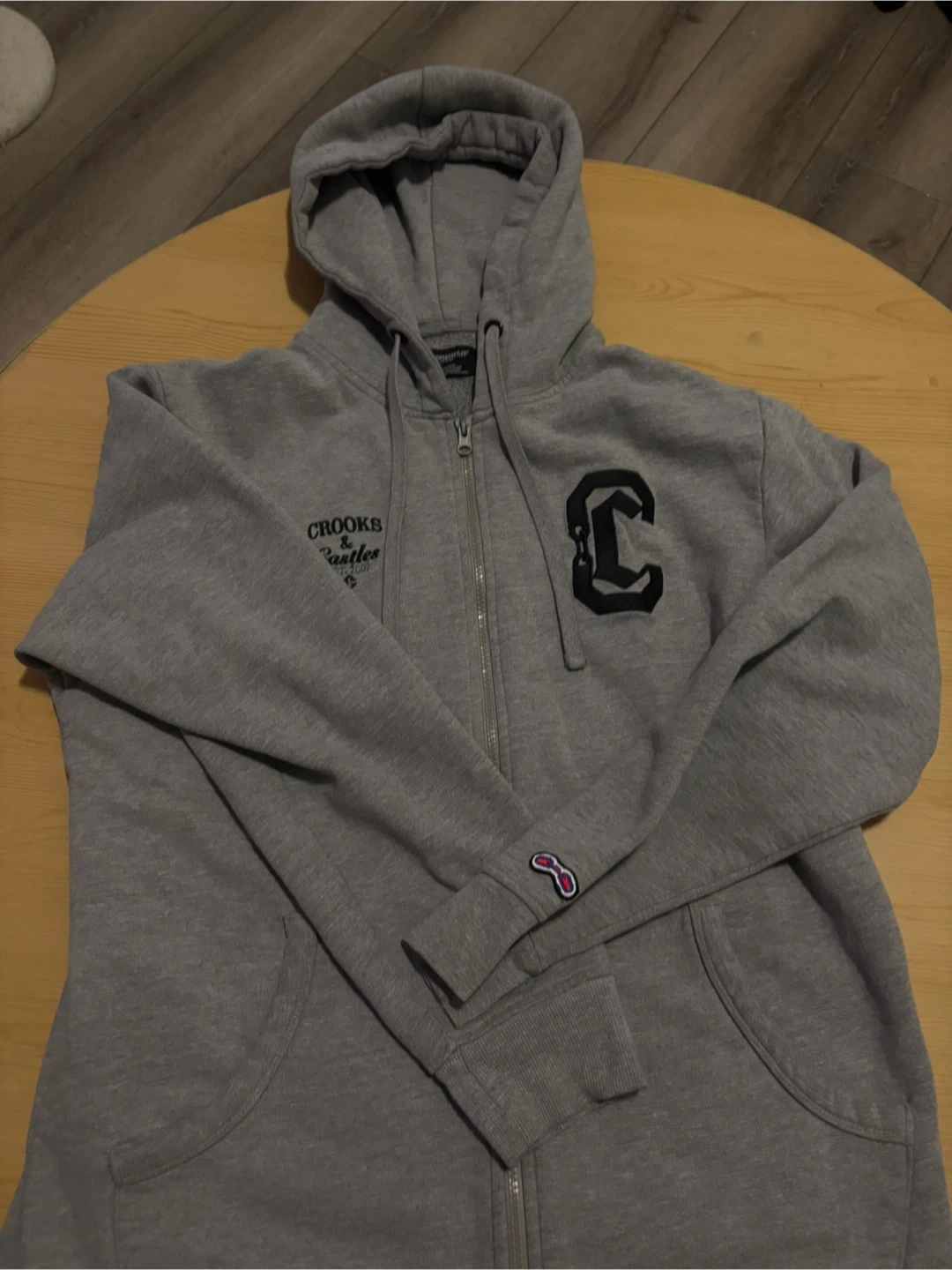 Selling a gently used grey zip-up hoodie from Crooks & Castles! It features the brand's logo and unique design on the front and back. Perfect for adding a bit of street style to your wardrobe. It's in great condition and ready for a new home!