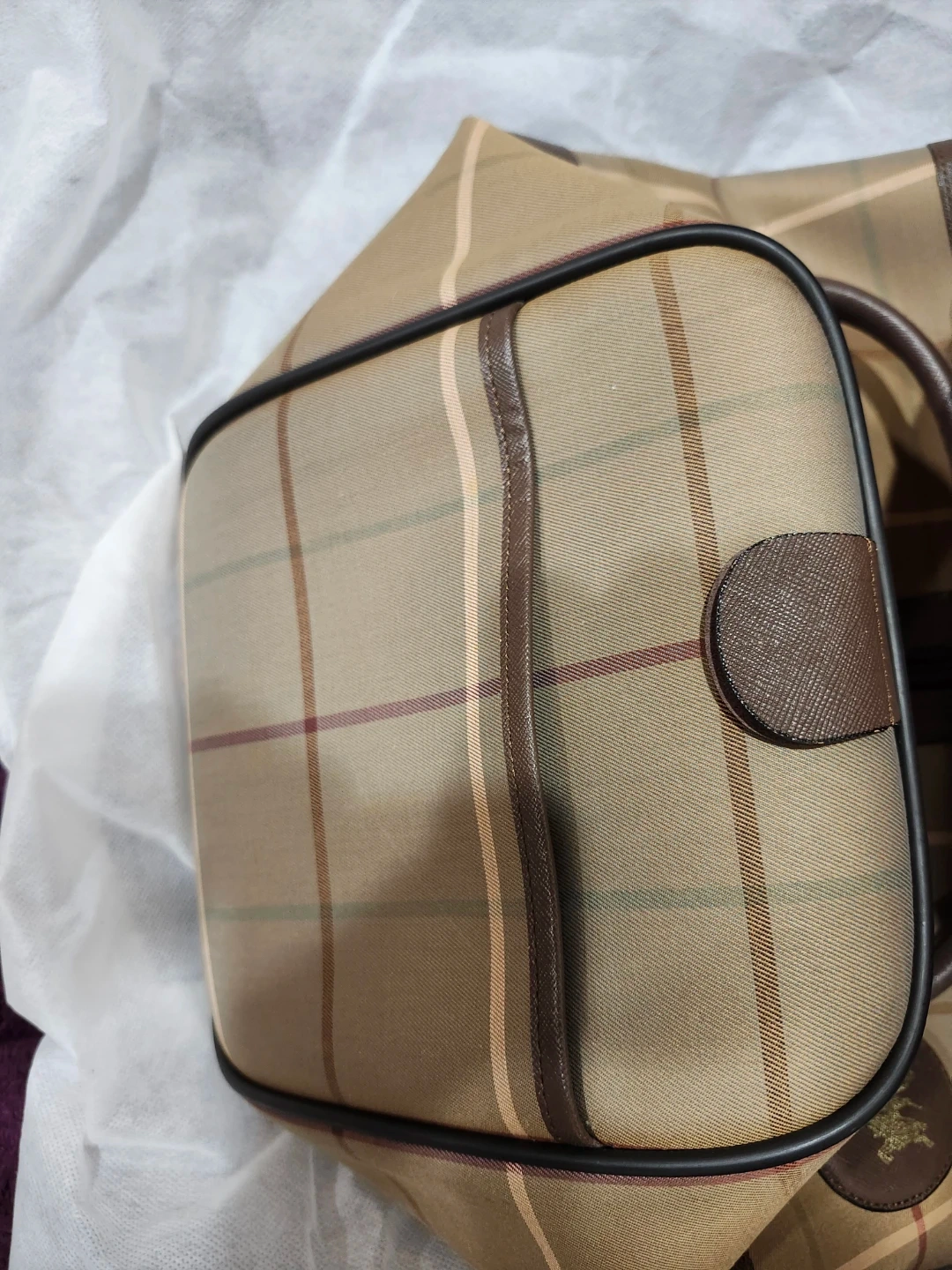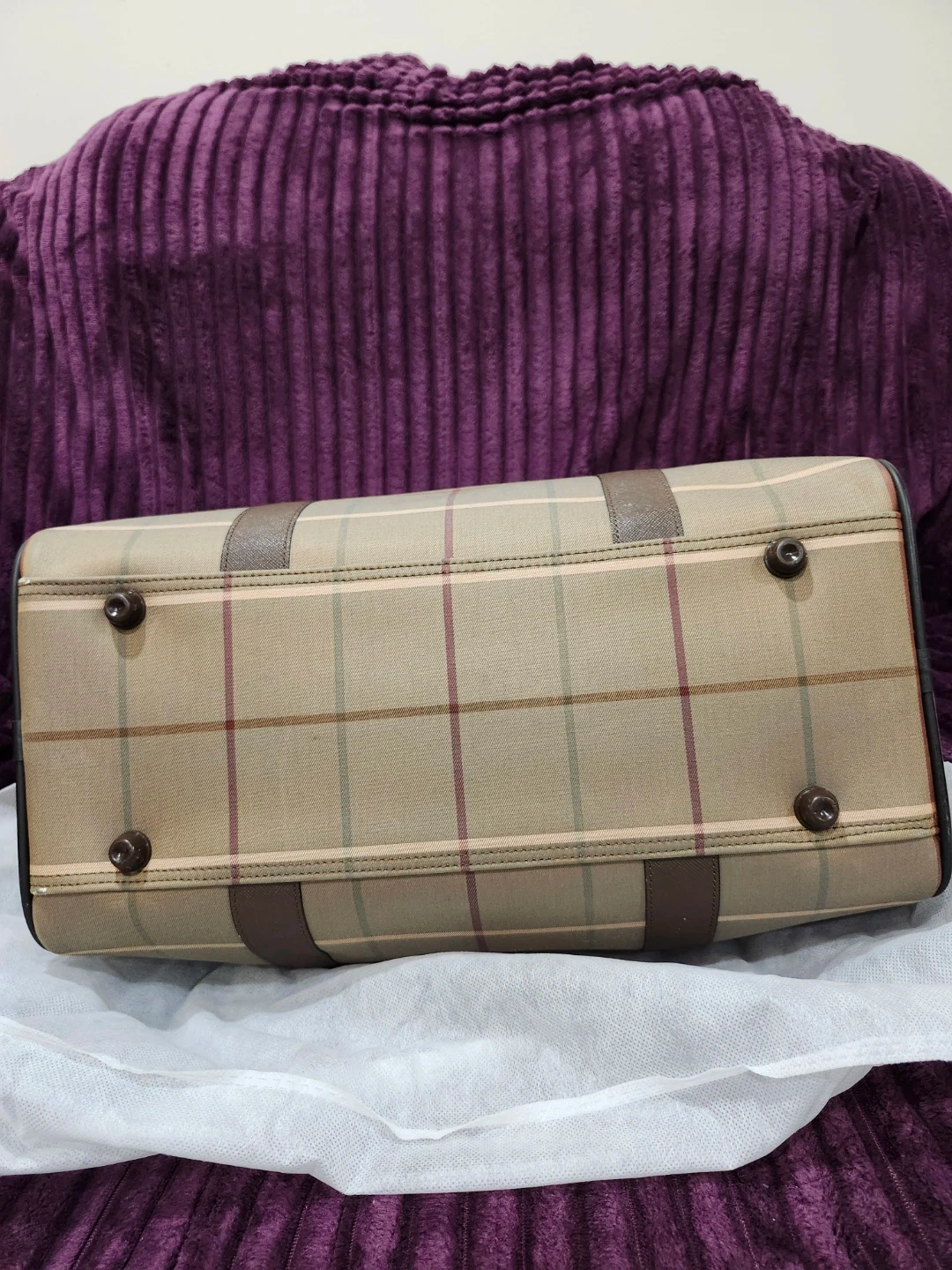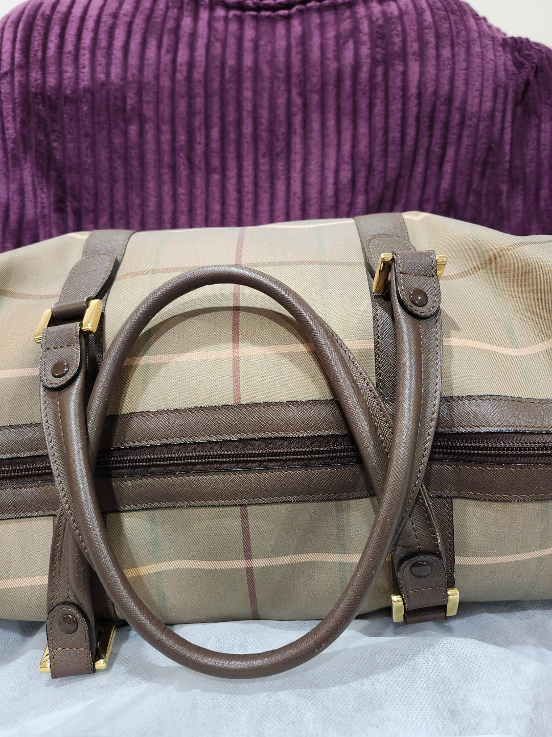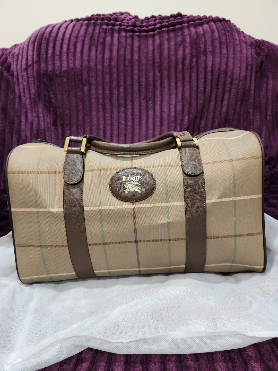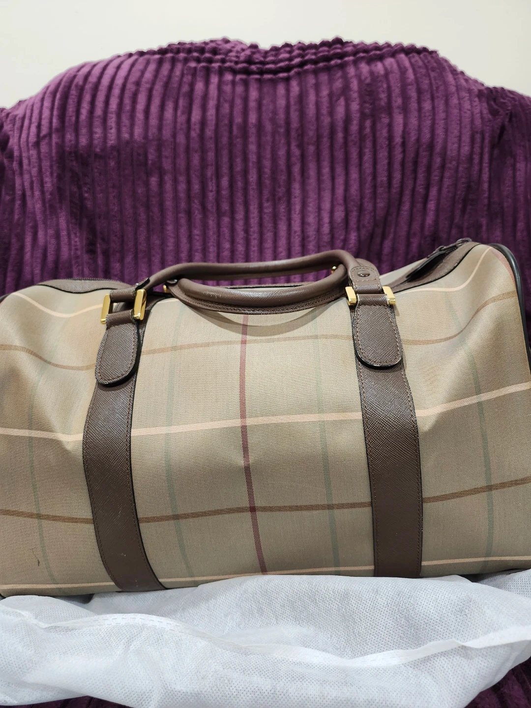 Classic Burberry's weekender bag in their signature plaid pattern. It's in great shape and ready for your next trip! The bag features brown leather accents and gold-tone hardware. It's a stylish and practical choice for travel or everyday use.