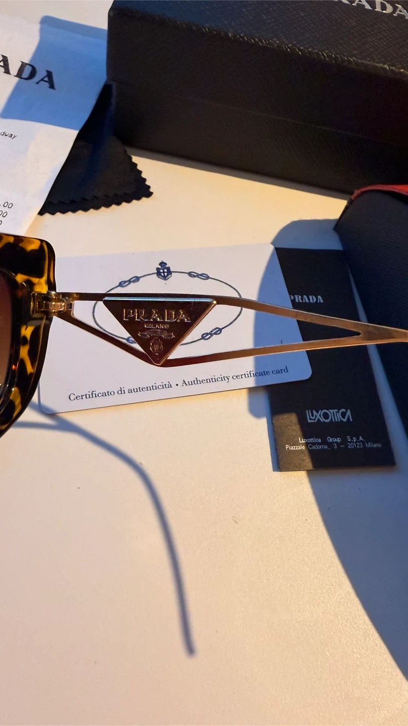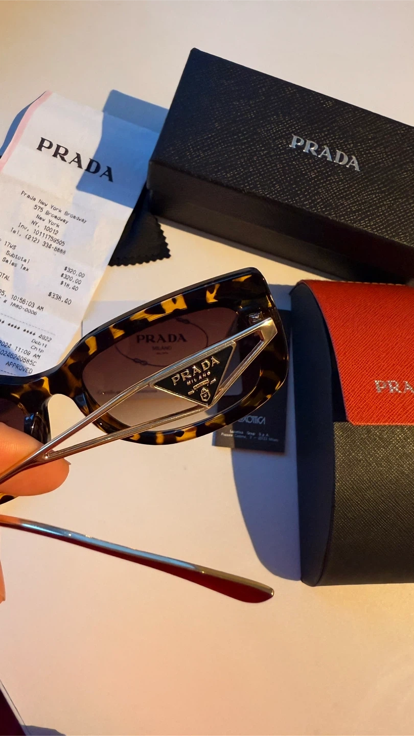 Selling a pair of Prada PR 17WS sunglasses in a stylish tortoise pattern! They are in excellent condition and come with the original box, case, and authenticity certificate. The receipt shows they were originally bought for $320 plus tax. A great accessory to complete any outfit!