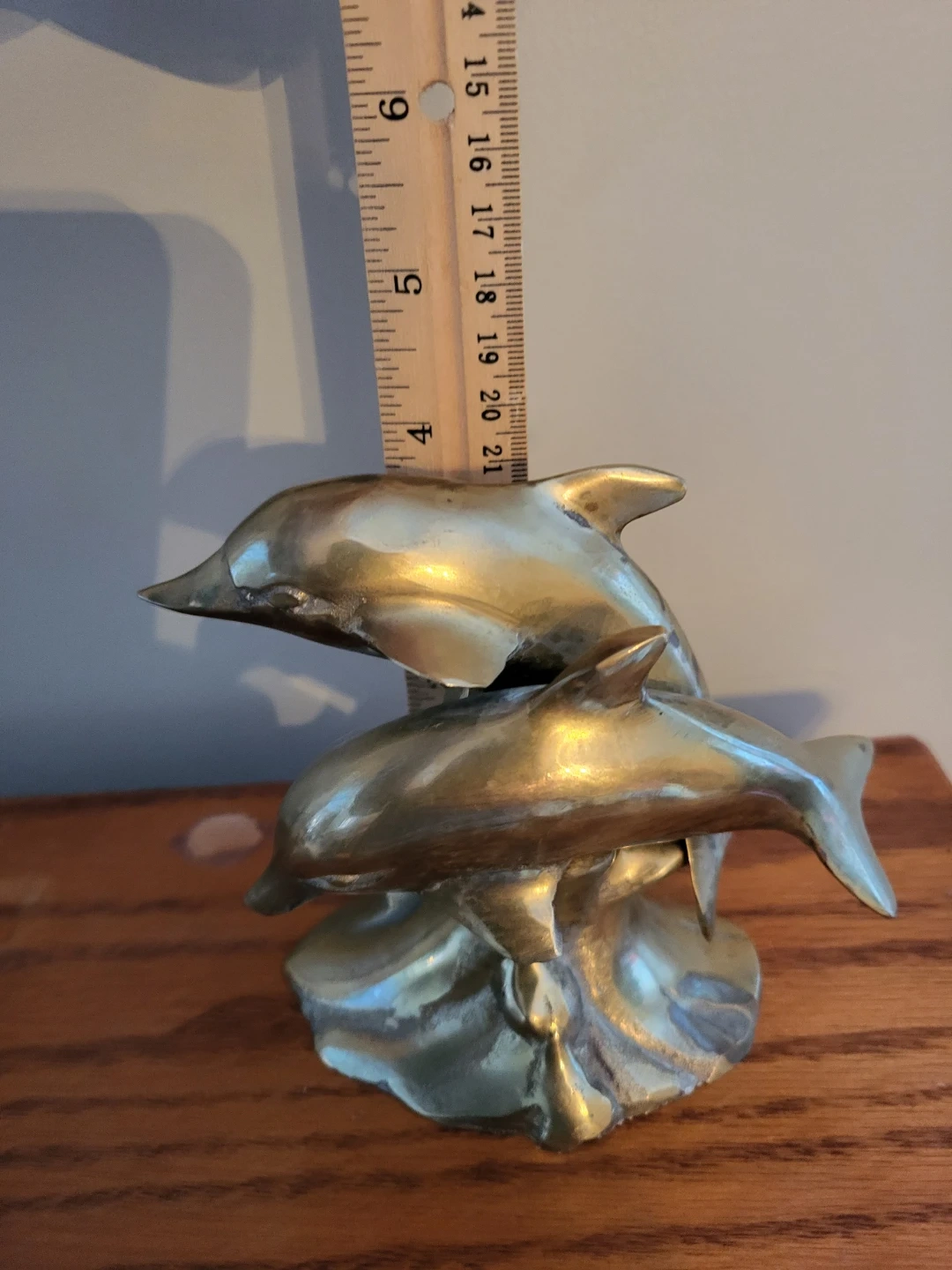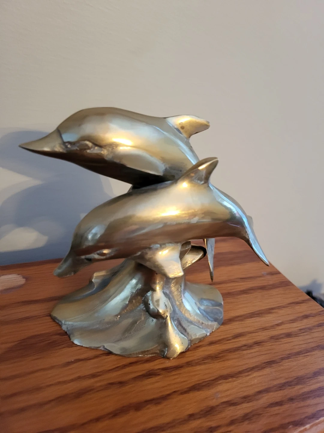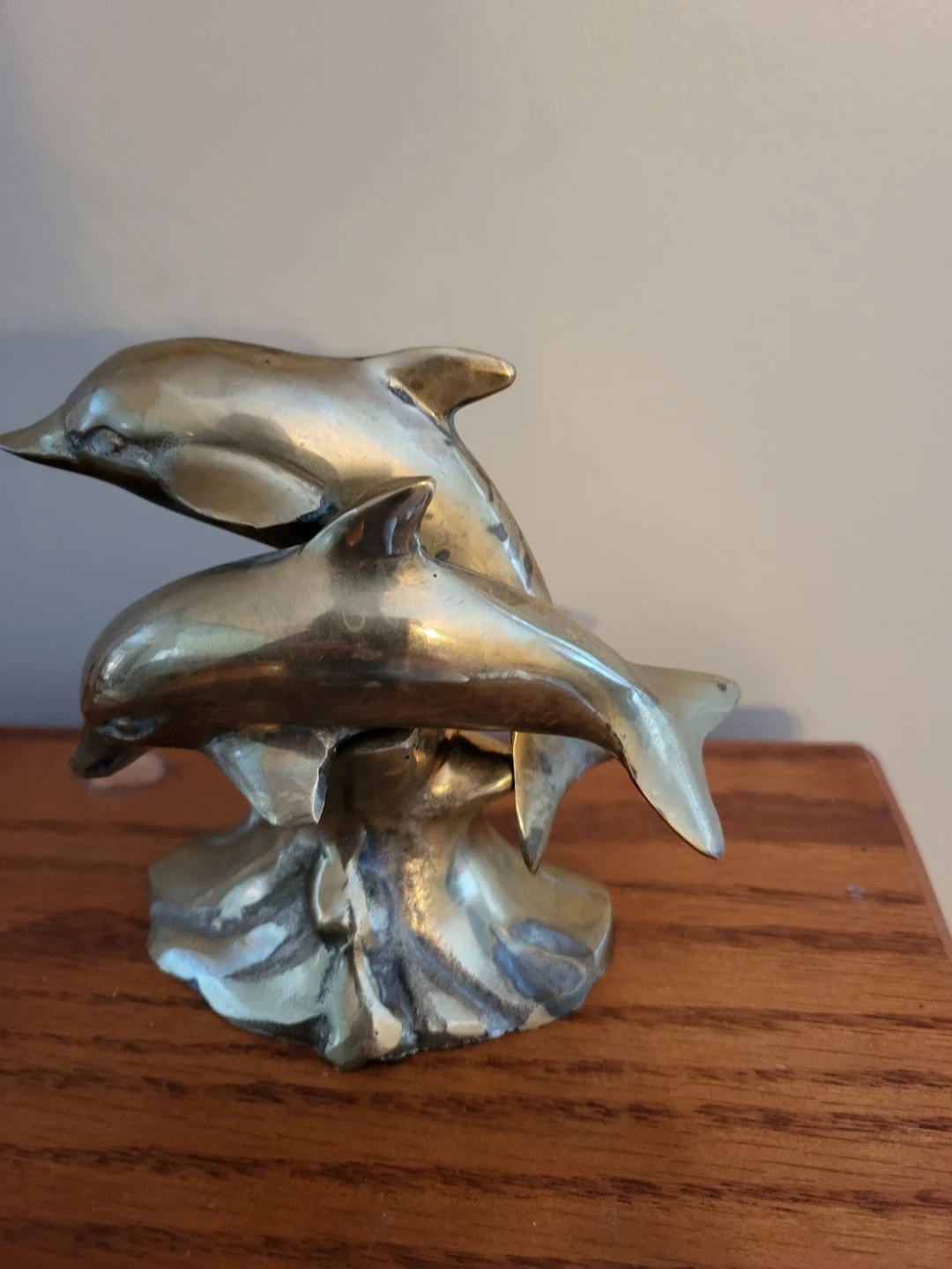 A lovely brass sculpture featuring two dolphins. It stands approximately 4 inches tall and would make a great addition to any collection or as a unique decorative piece!