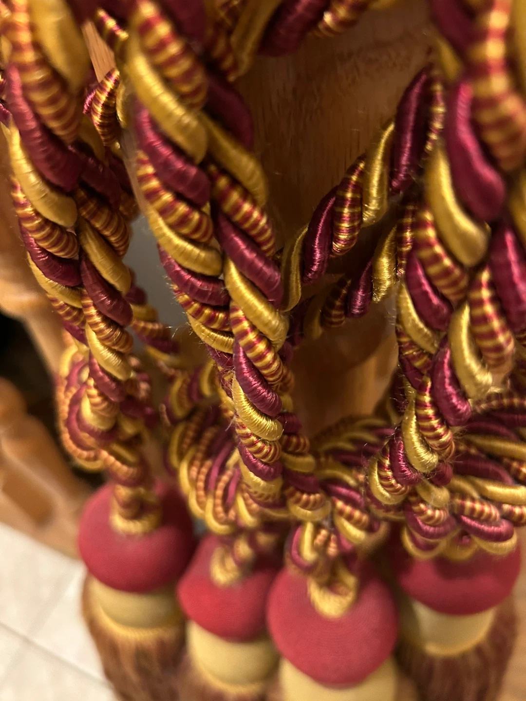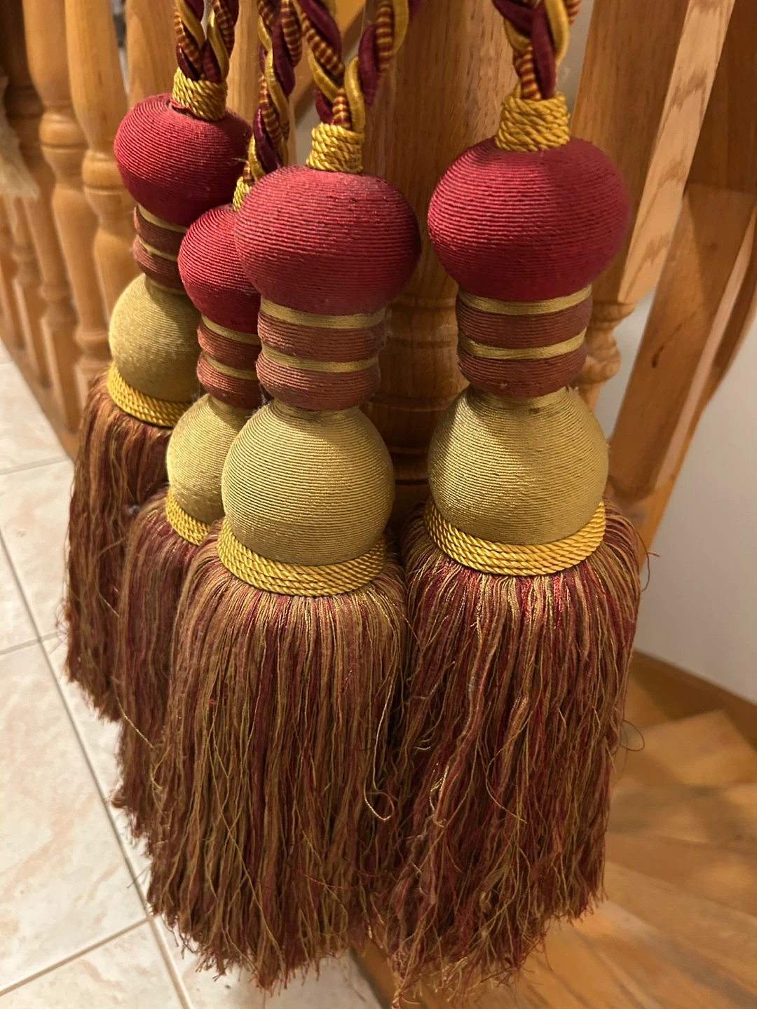 Selling a set of decorative tassels in burgundy, gold, and brown. They would make a great addition to curtains, furniture, or as decorative accents in your home. They have a lovely, rich colour and texture!