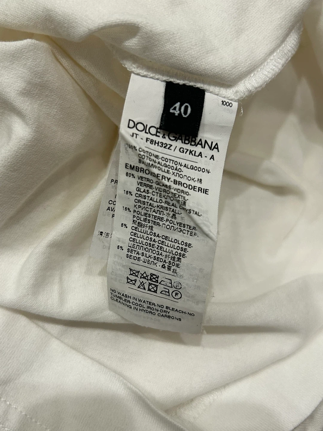 Brand new Dolce & Gabbana (dg) authentic men's and women's white crew neck short-sleeved T-shirt with distinctive heavy embroidery on the chest. Made of crystal beads and mulberry silk.