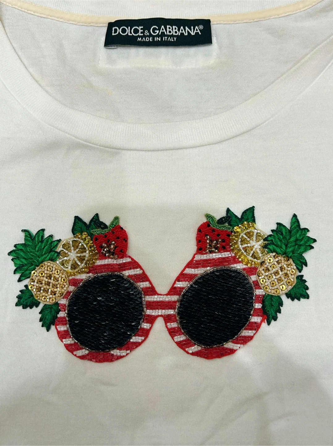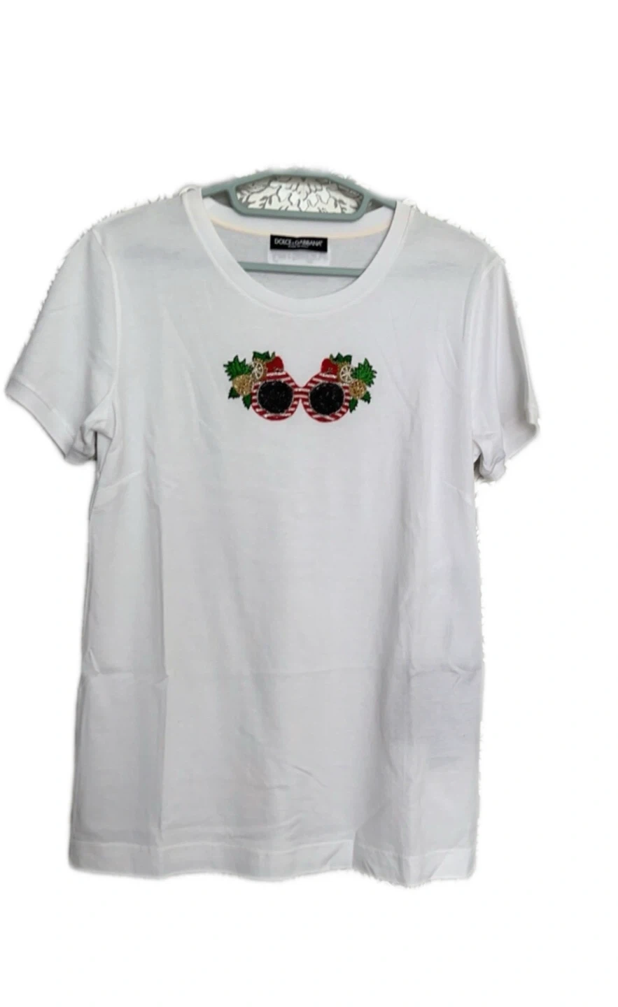 Selling a Dolce & Gabbana white T-shirt. The size is 40, and it features a unique sunglasses embroidery design. Made in Italy, this stylish tee is in great condition and ready for a new wardrobe!