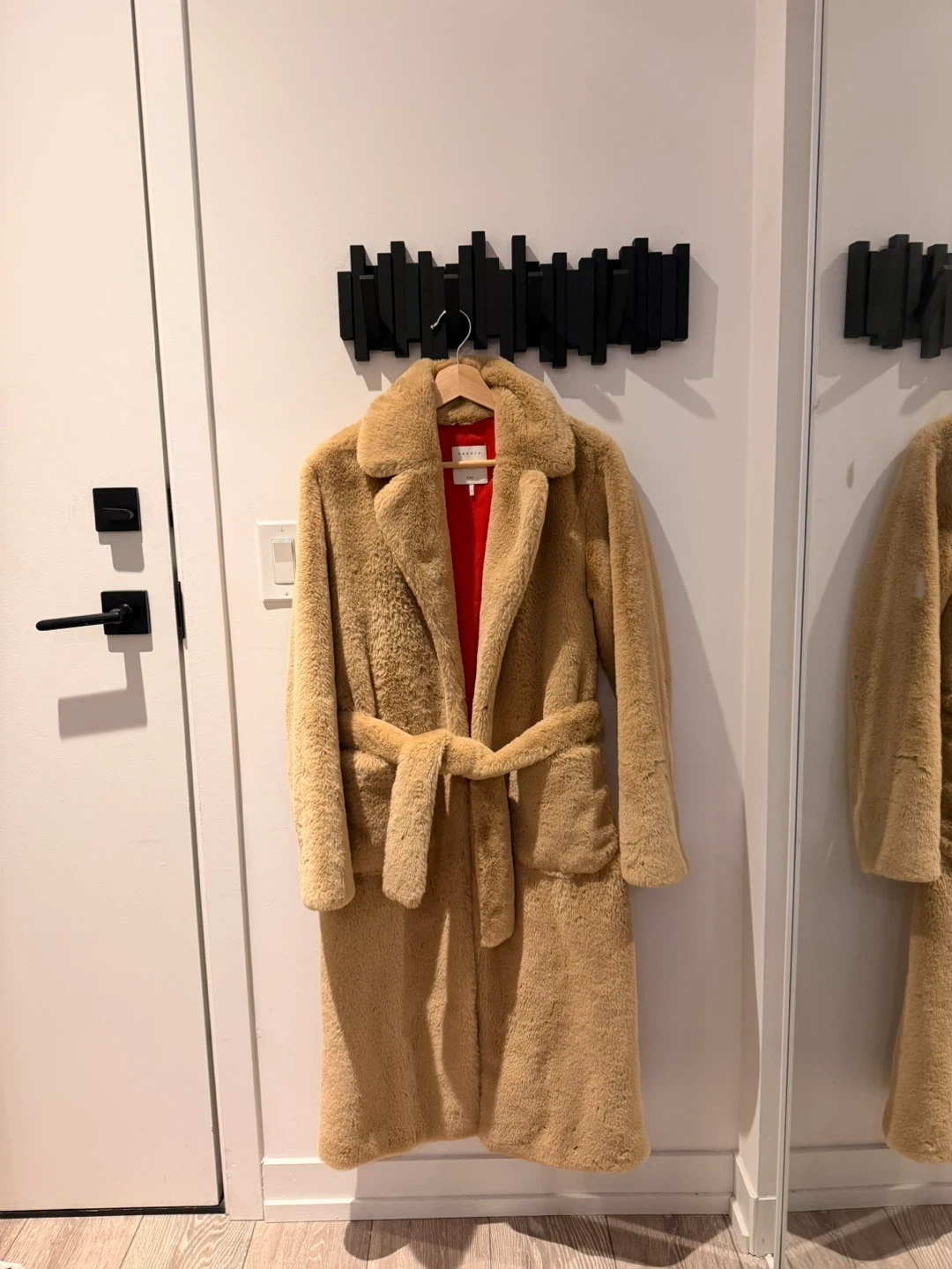 Selling a Sandro Paris faux fur coat! It's a beautiful, soft coat that's perfect for staying warm and stylish. The coat features a belt, allowing you to cinch the waist for a flattering silhouette. The red lining adds a pop of colour! Worn once so it’s almost brand new, but selling this because I got a real fur coat that looks very similar.