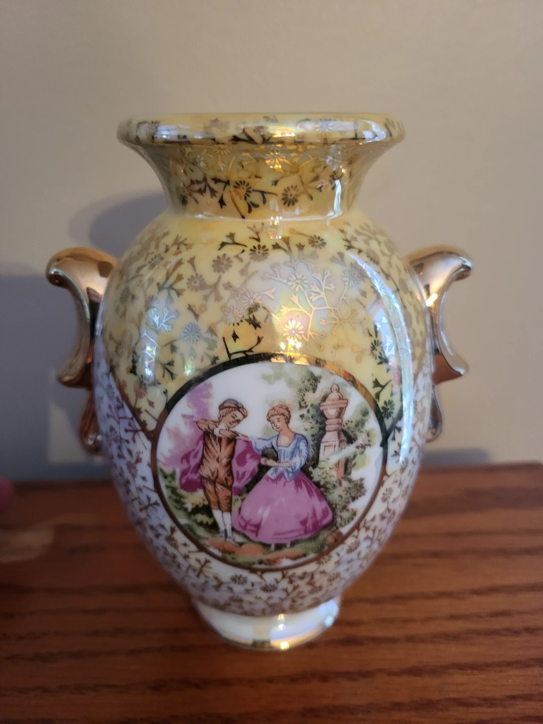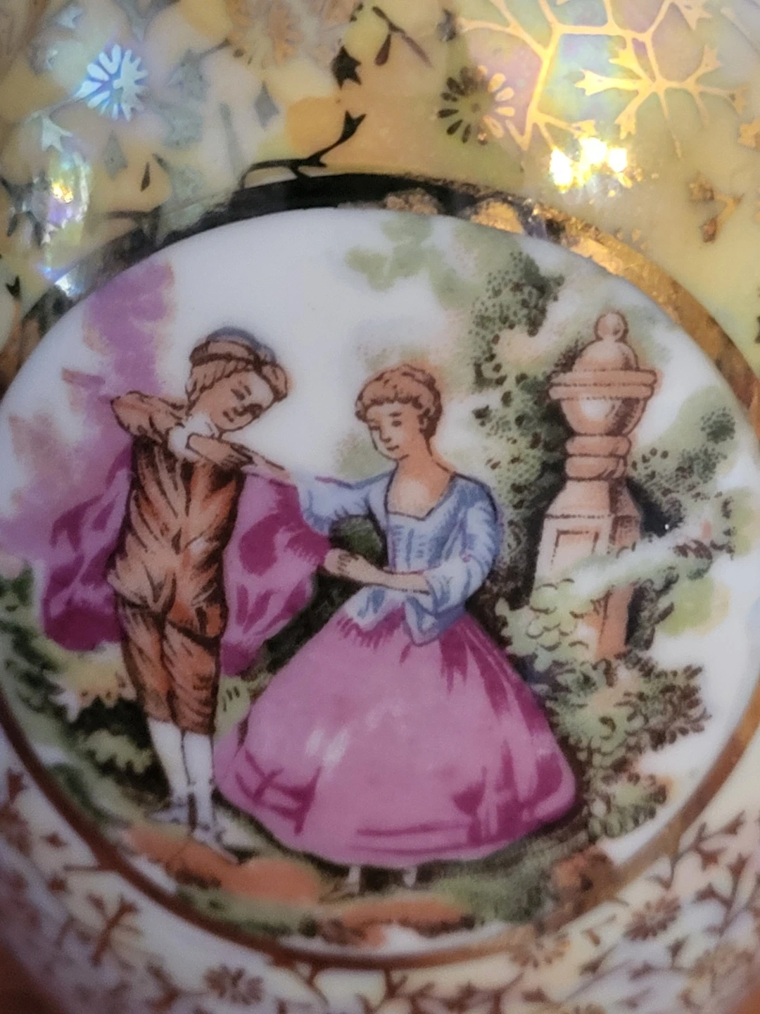 Selling a decorative vase with a unique design! It features a charming scene of people in period clothing and intricate gold detailing. It would make a lovely addition to any home.