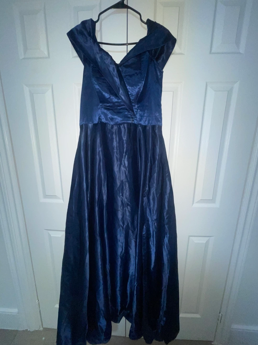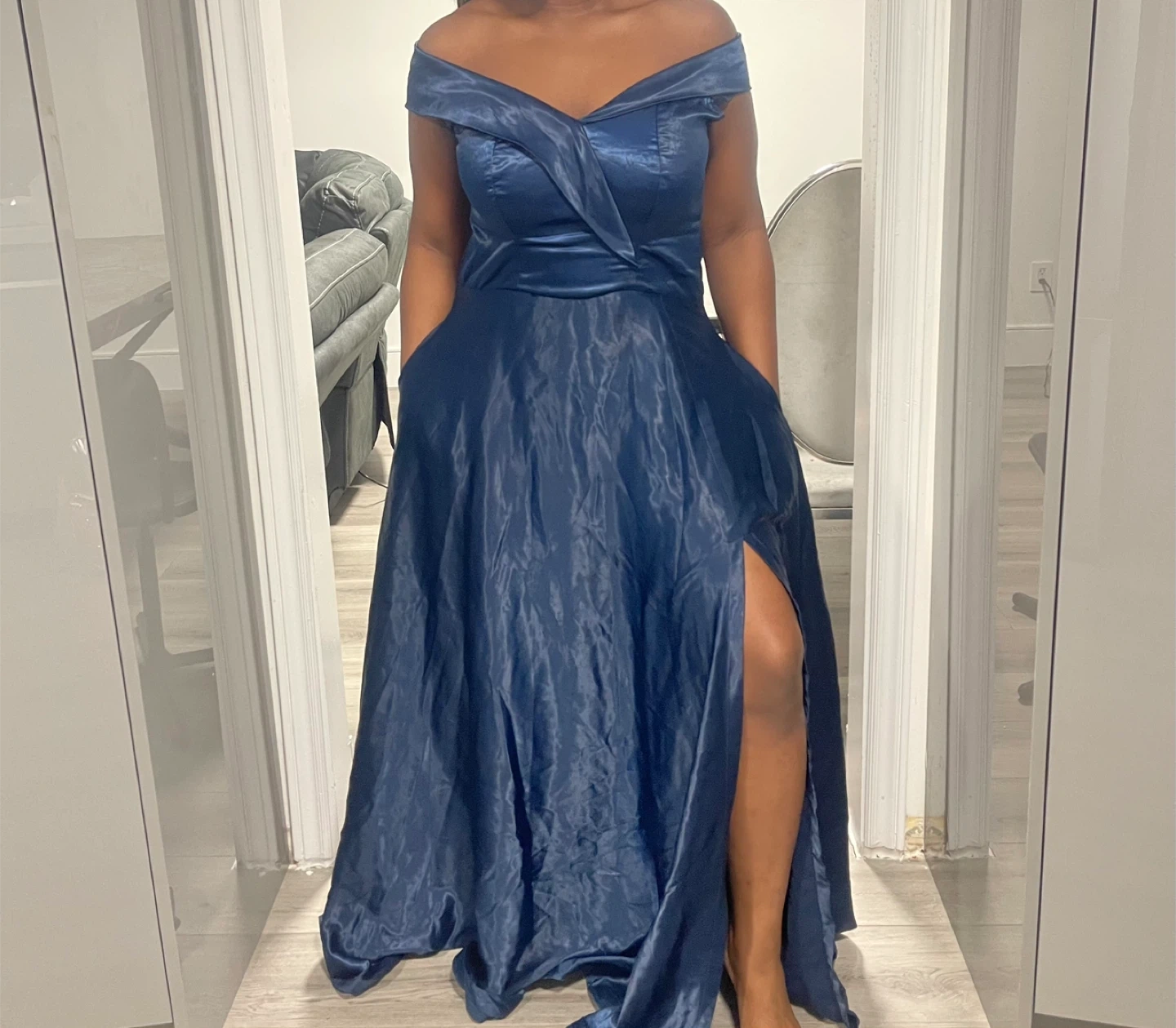 Selling a beautiful blue off-shoulder formal dress. It features a flattering neckline and a stylish high slit and pockets. Perfect for a special occasion!