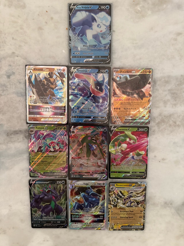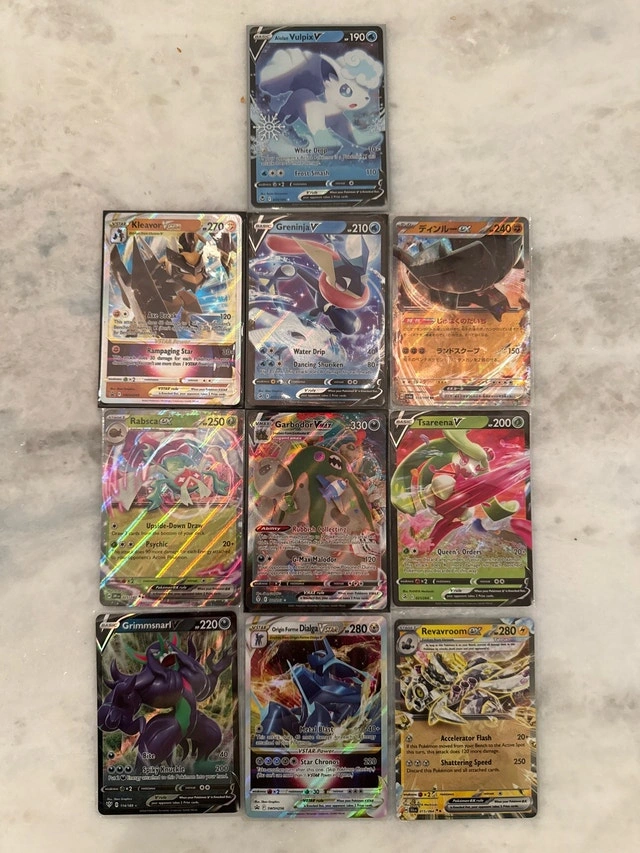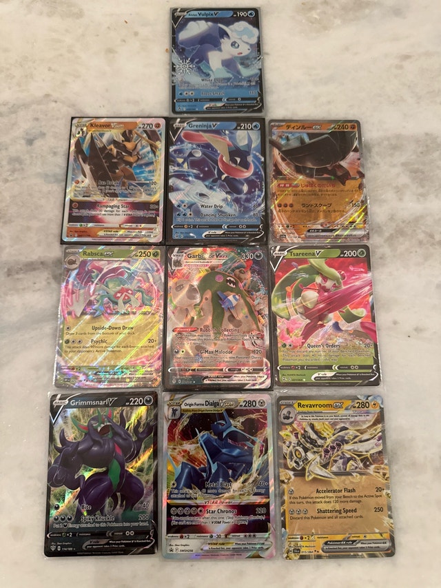 I'm selling a set of assorted Pokemon V cards, all in near mint condition. Each card features stunning artwork and powerful abilities, ready to enhance your collection or give you an edge in battles. As the cards are available, the advertisement is live.