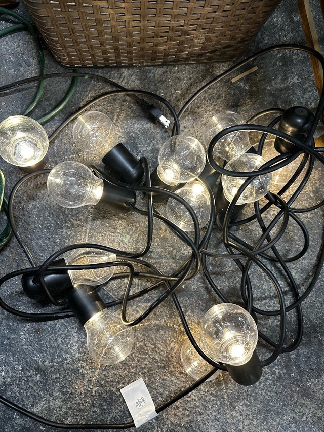 Brighten up your outdoor space with these Globe String Lights, perfect for patios, gardens, or balconies. These lights are in used condition but still provide a warm and inviting glow. They are ideal for creating a cozy atmosphere for evening gatherings. * Bulb Type: Globe * Cord Colour: Black * Power Source: Plug-in Looking to add a touch of magic to your backyard? These string lights are just the ticket!