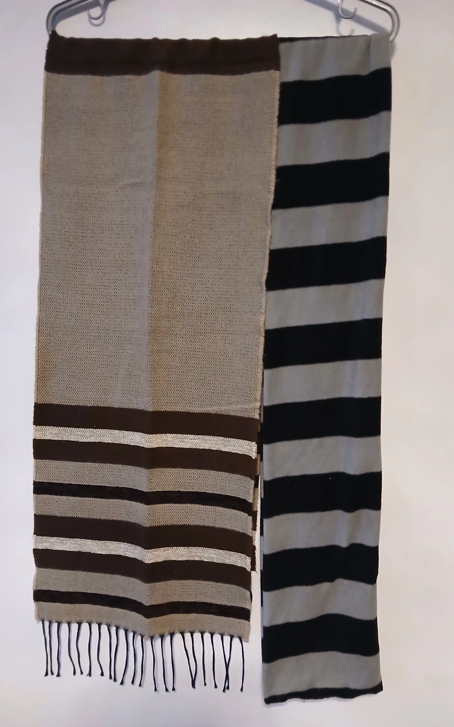 Cozy striped scarf in neutral tones! One scarf features a mix of brown and beige stripes with fringe. It measures 60" × 12".