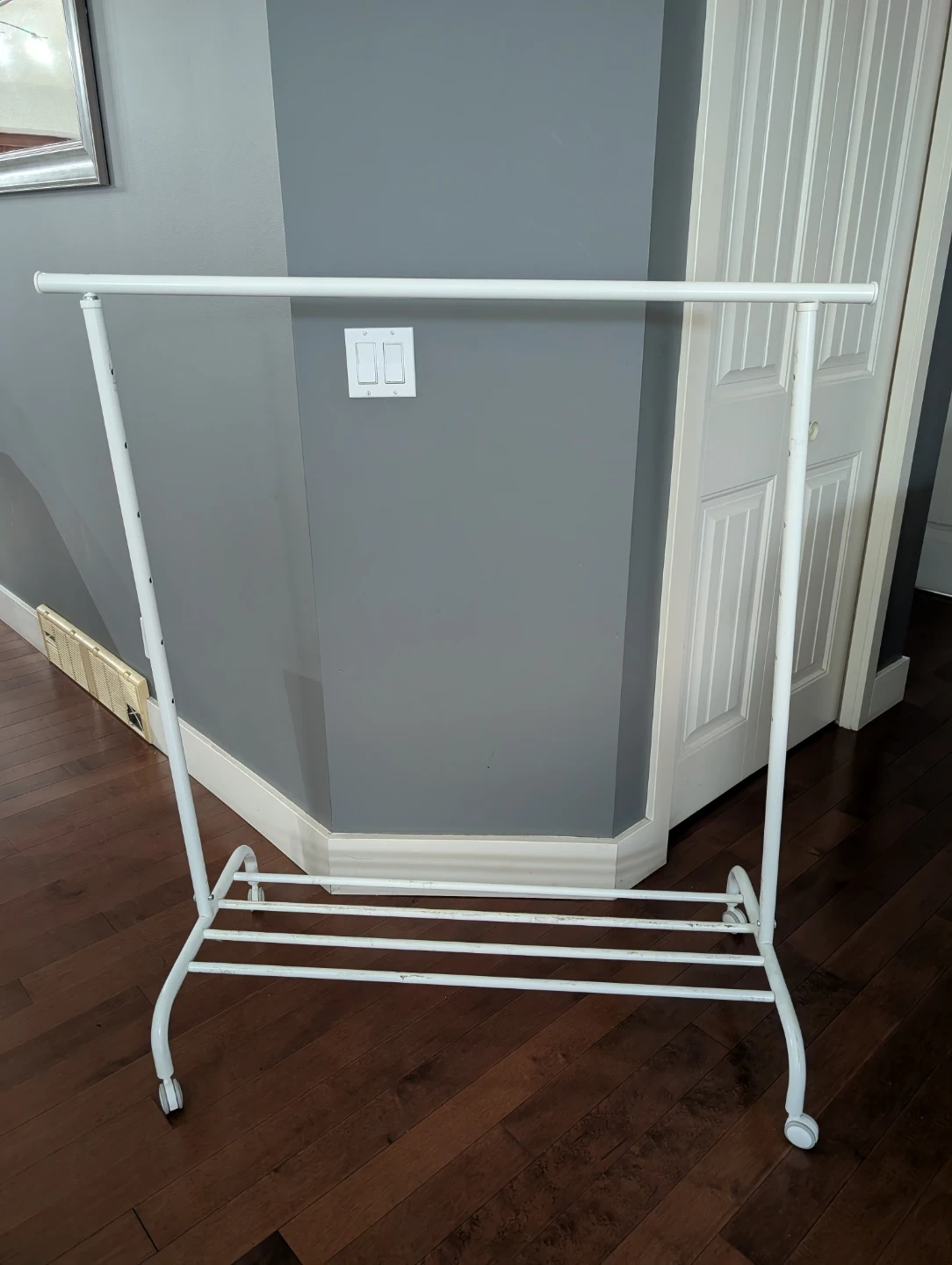 Selling an IKEA Rigga clothes rack in white! It's in great shape and super handy for extra storage or organizing your closet. Easy to assemble and move around