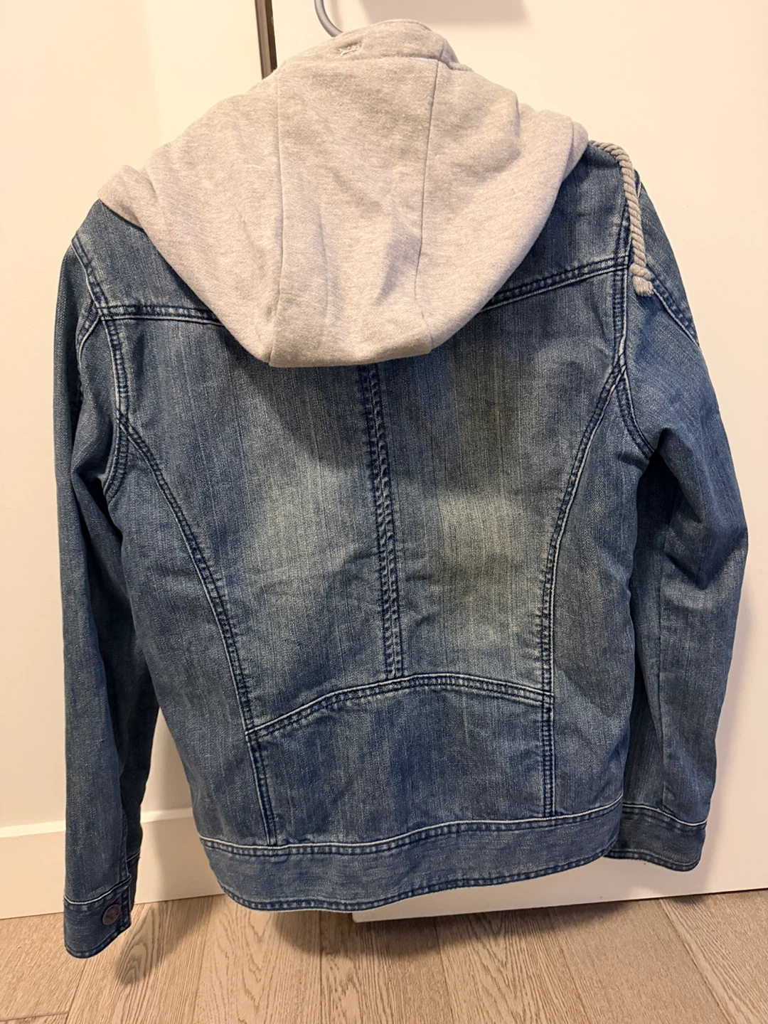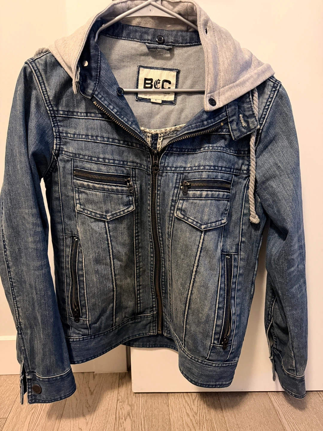 Here's a stylish BCC denim jacket with a grey hood! It features a zip-up front and pockets, perfect for layering. It's in great condition and ready for a new home!