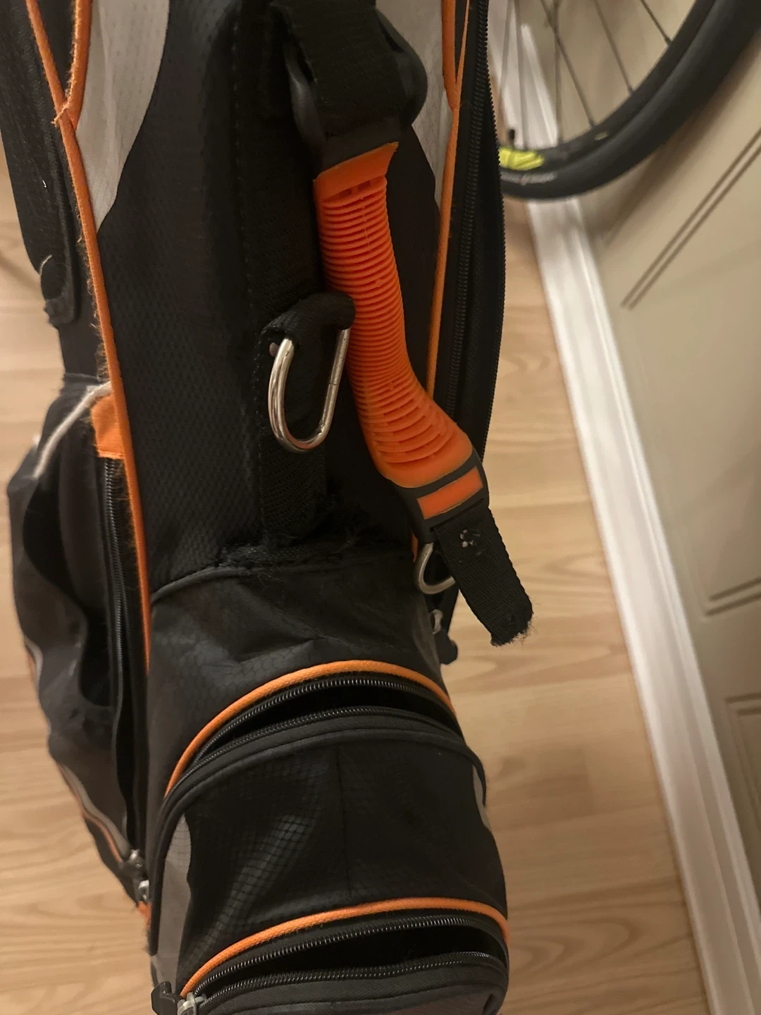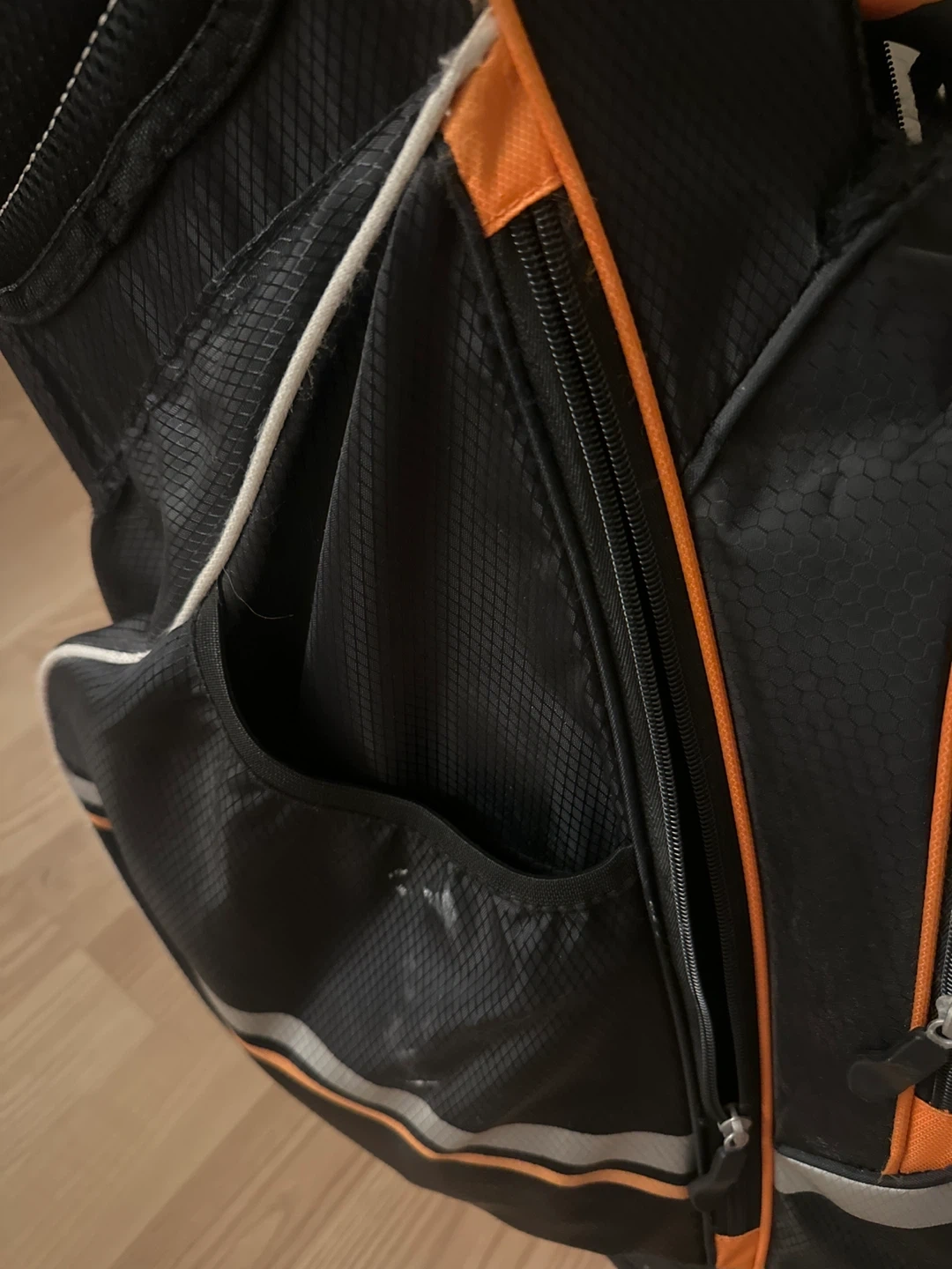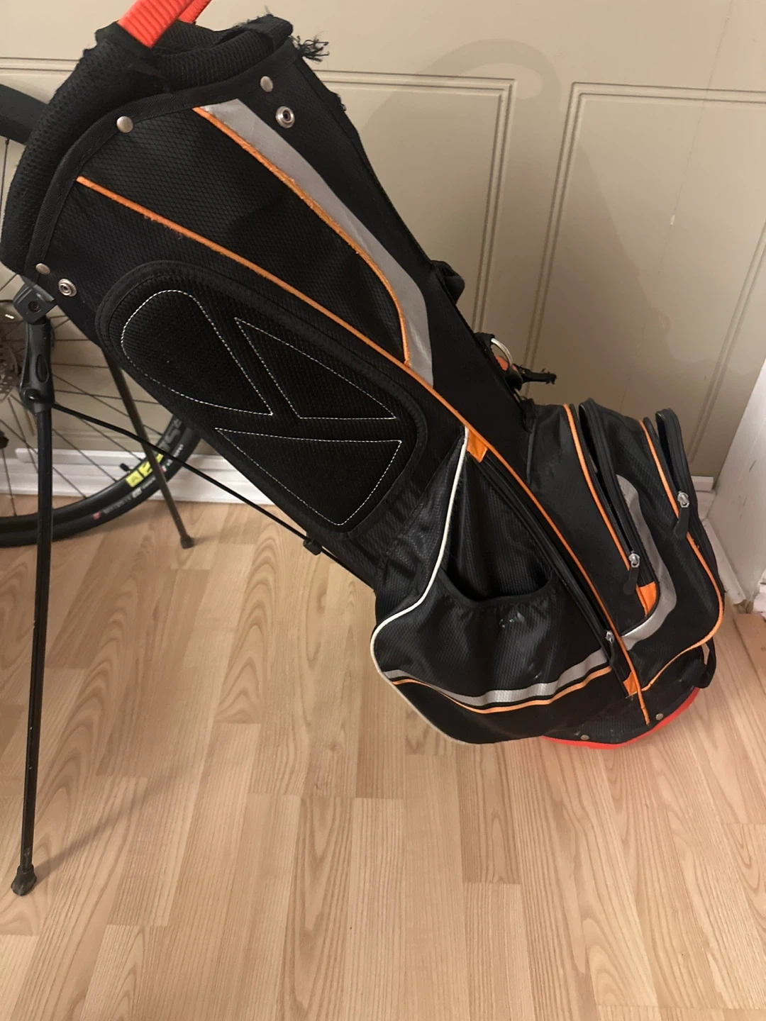 Selling a TPX by Powerbilt golf stand bag. It's black with orange and silver accents. The bag has some wear and tear, as shown in the photos, but it's still functional for carrying your clubs around the course