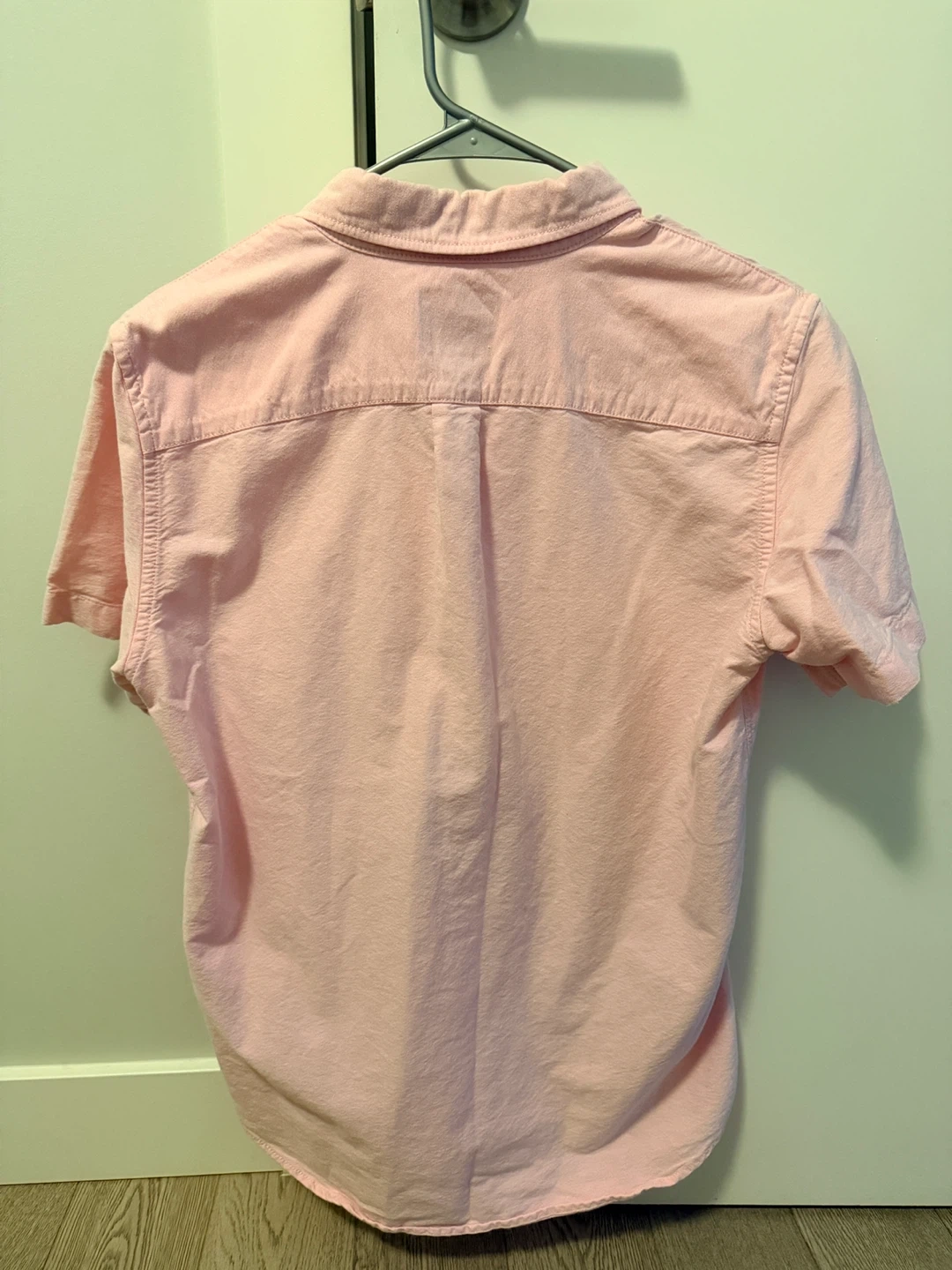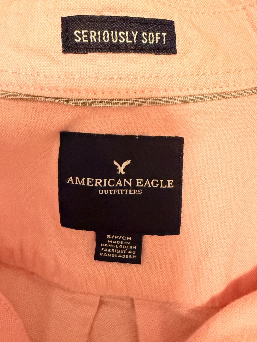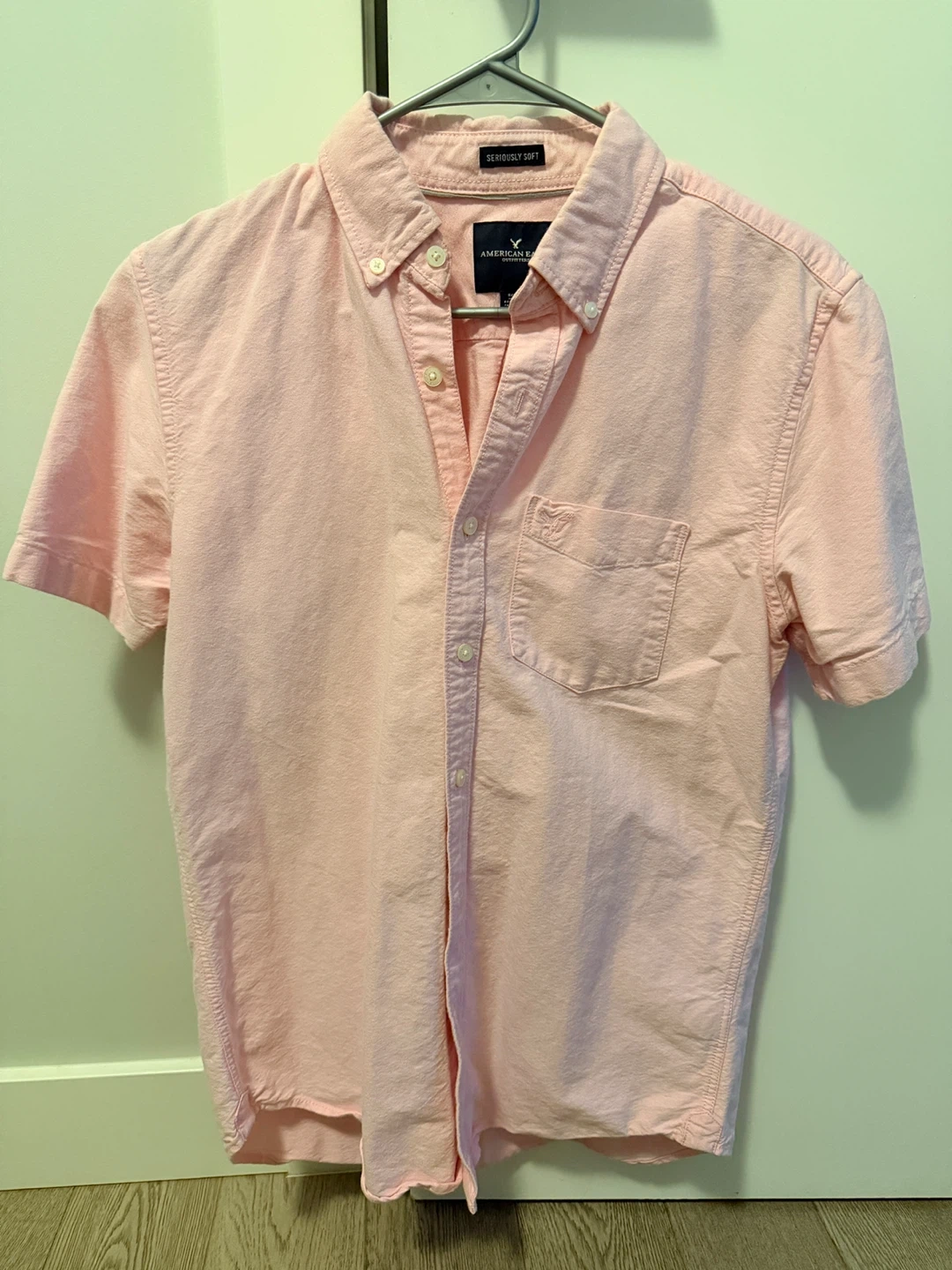 Here's a gently used American Eagle short-sleeve shirt in a soft pink colour. It's a size small and feels seriously soft to the touch. Perfect for a casual, comfy look!