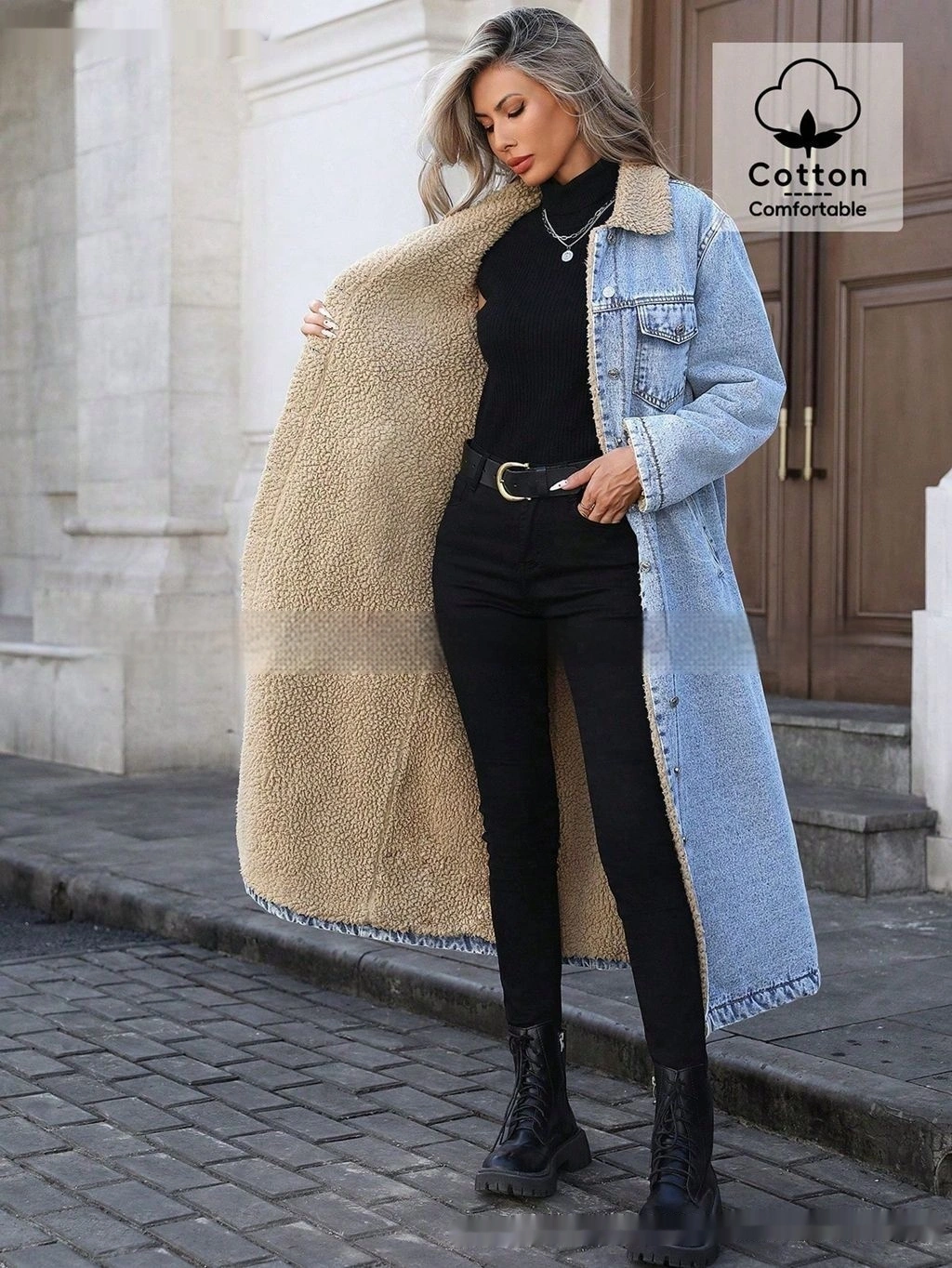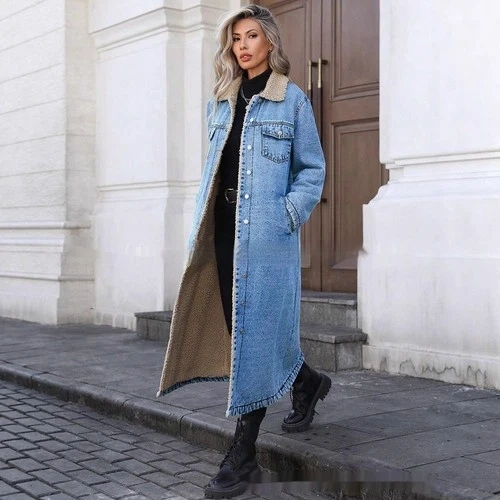 Womens Loose, Long, Fleece-lined Cotton Denim Jacket