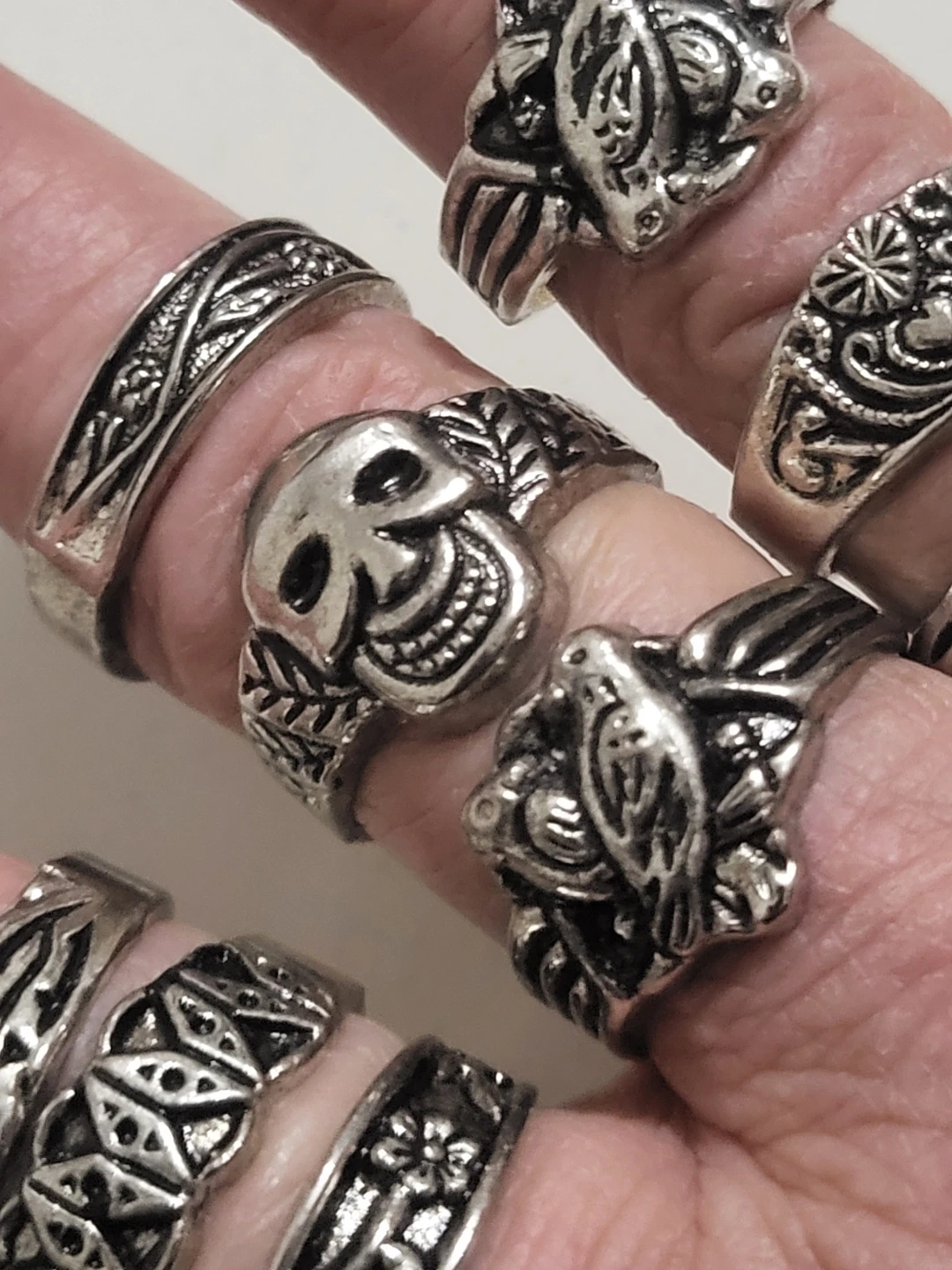 Selling a collection of assorted silver-tone rings. They feature various designs, including skulls, floral patterns, and geometric shapes. Great for adding a unique touch to your style!