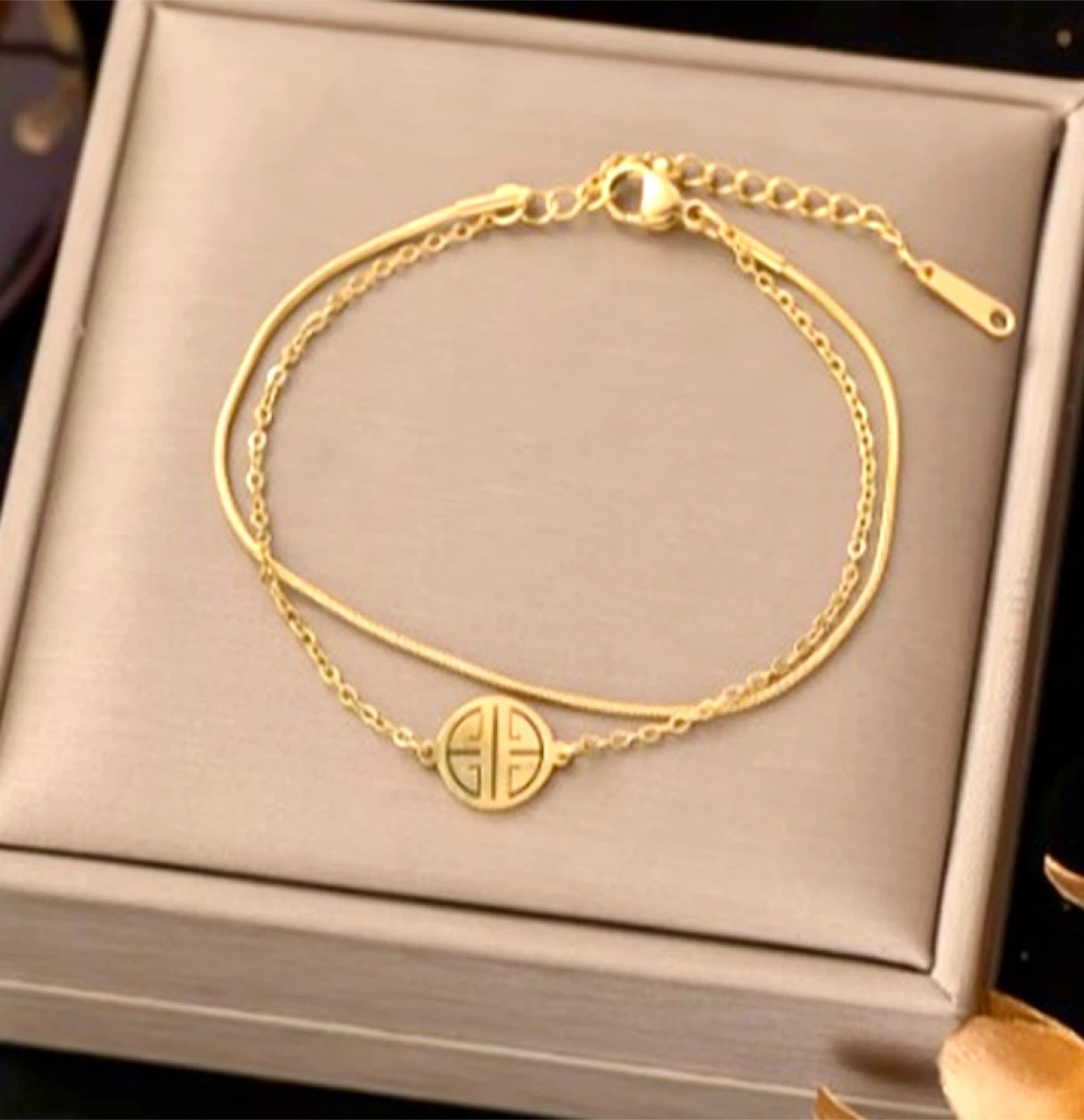 Selling a beautiful gold double-layer bracelet. It's in great condition and would make a lovely addition to any outfit!