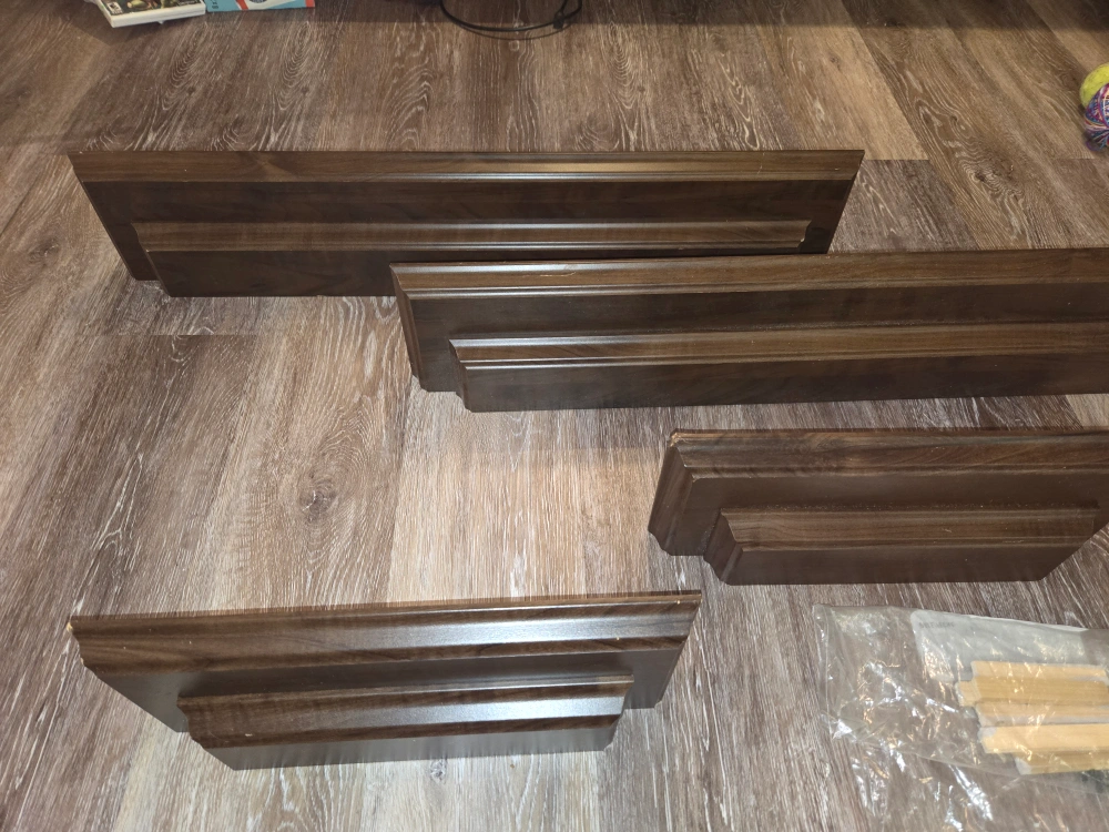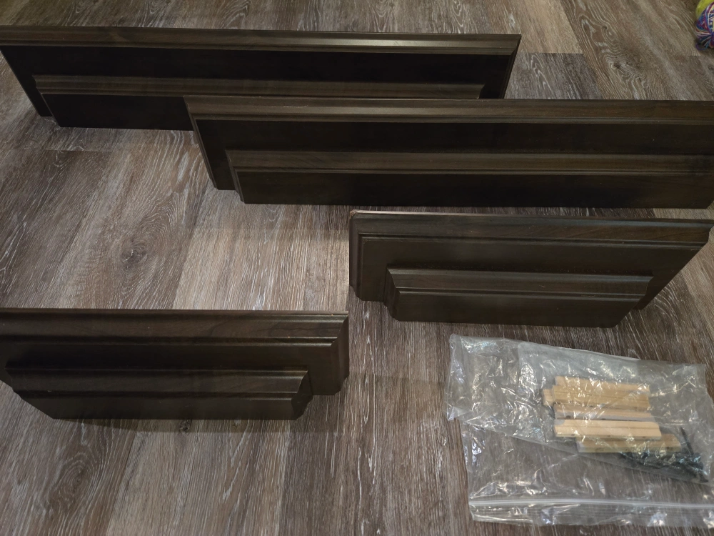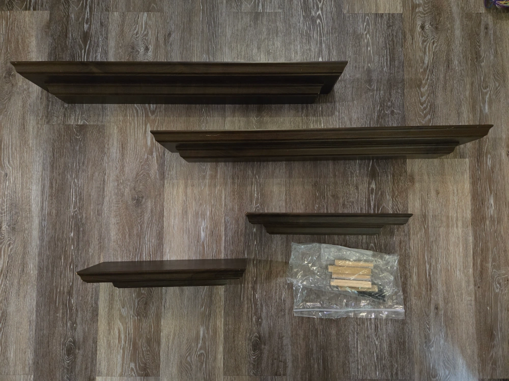 Selling a set of four wooden wall floating shelves in a dark brown colour. They come with the necessary hardware for mounting. Great for adding some storage or display to any room in your home!